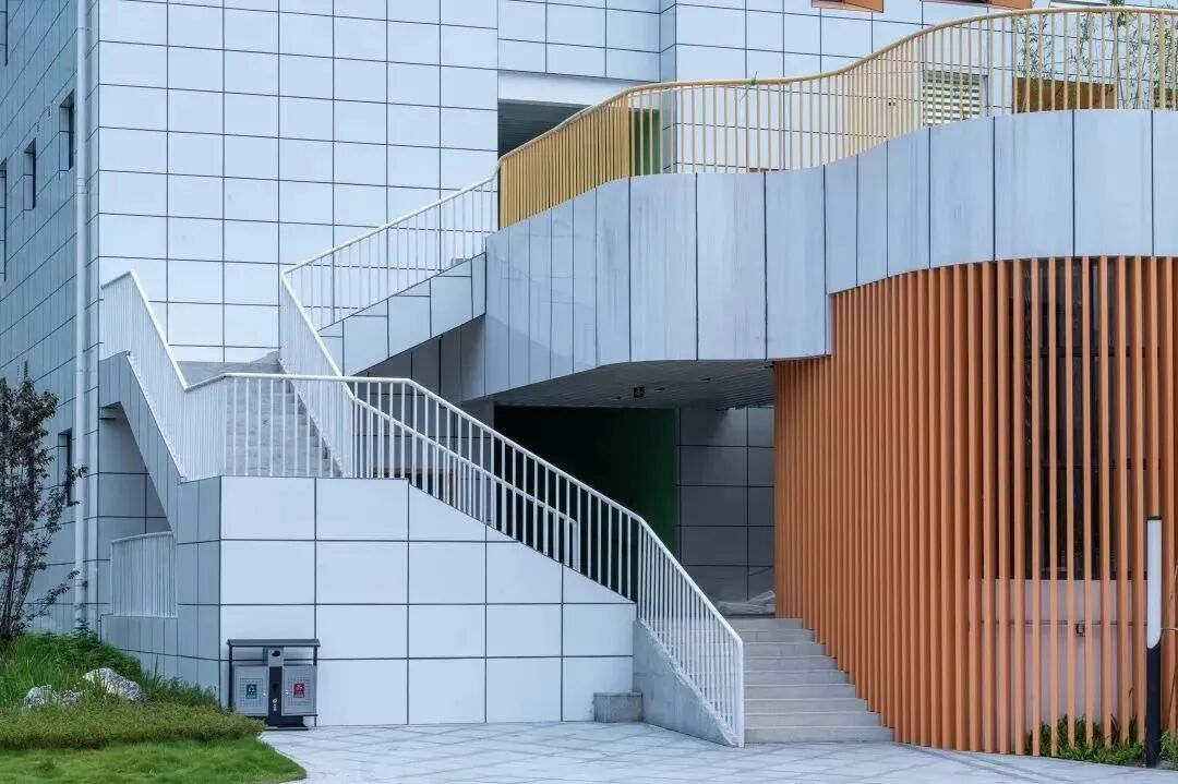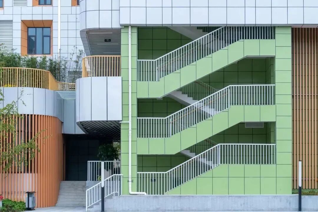 学校采用双重半围合式的建筑布局,大面积的白色运用,加上木纹色与果绿色的点缀。