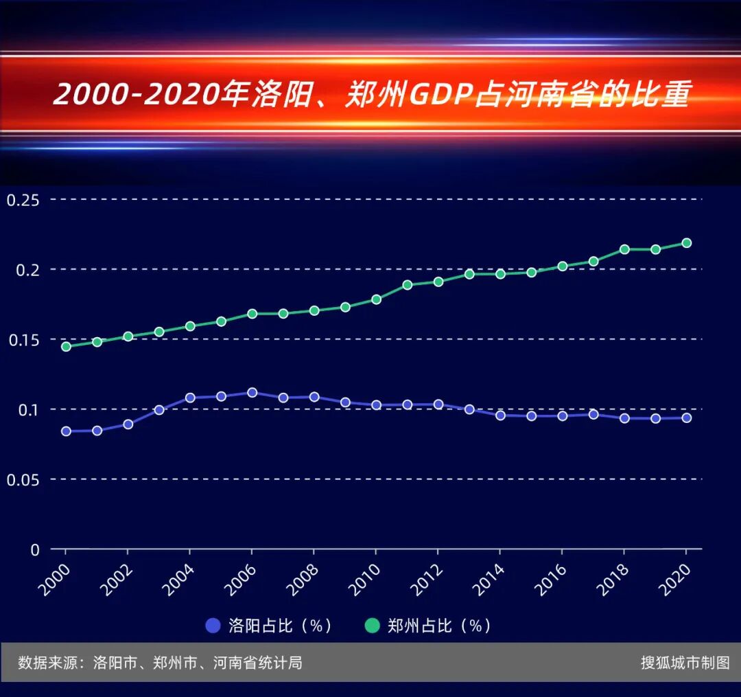 与此同时,2000至2020年,洛阳与郑州占河南省经济总量的比重也呈现出了完全不同的走势。