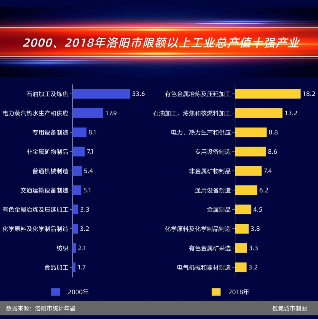 由于近两年洛阳相关产业数据尚未发布,搜狐城市选取了洛阳市2000年和2018年工业总产值排名前十的工业行业进行对比,结果发现2000年洛阳市尚有纺织业、食品加工业两类轻工业能够跻身前十,但到了2018年,洛阳市产值排名前十的工业行业已全部为重工业,并且占全市限额以上工业总产值的比重高达77.2%,轻重工业比重依旧失调。