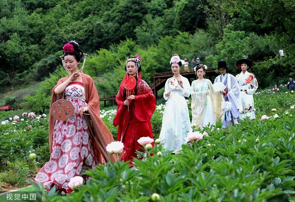 栾川县九鼎沟国际鲜花出口基地,游人着古装徜徉花海