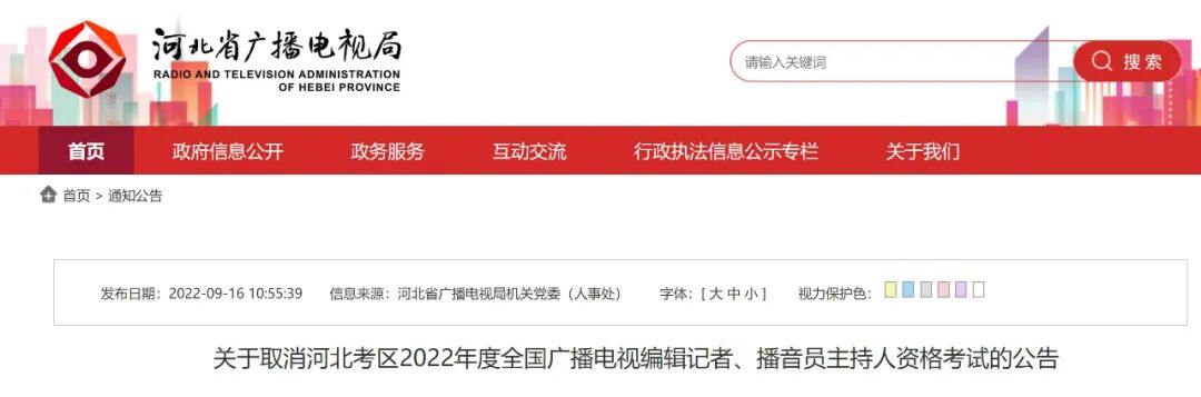 关于取消河北考区2022年度全国广播电视编辑记者、播音员主持人资格考试的公告