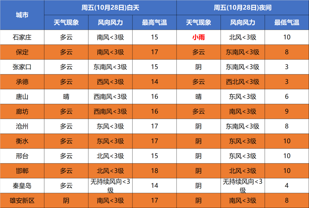 明天白天,石家庄西部、邢台西部阴有小雨或零星小雨,其他地区多云。最高温度,张家口、承德、保定西北部9~12℃,其他地区13~19℃。