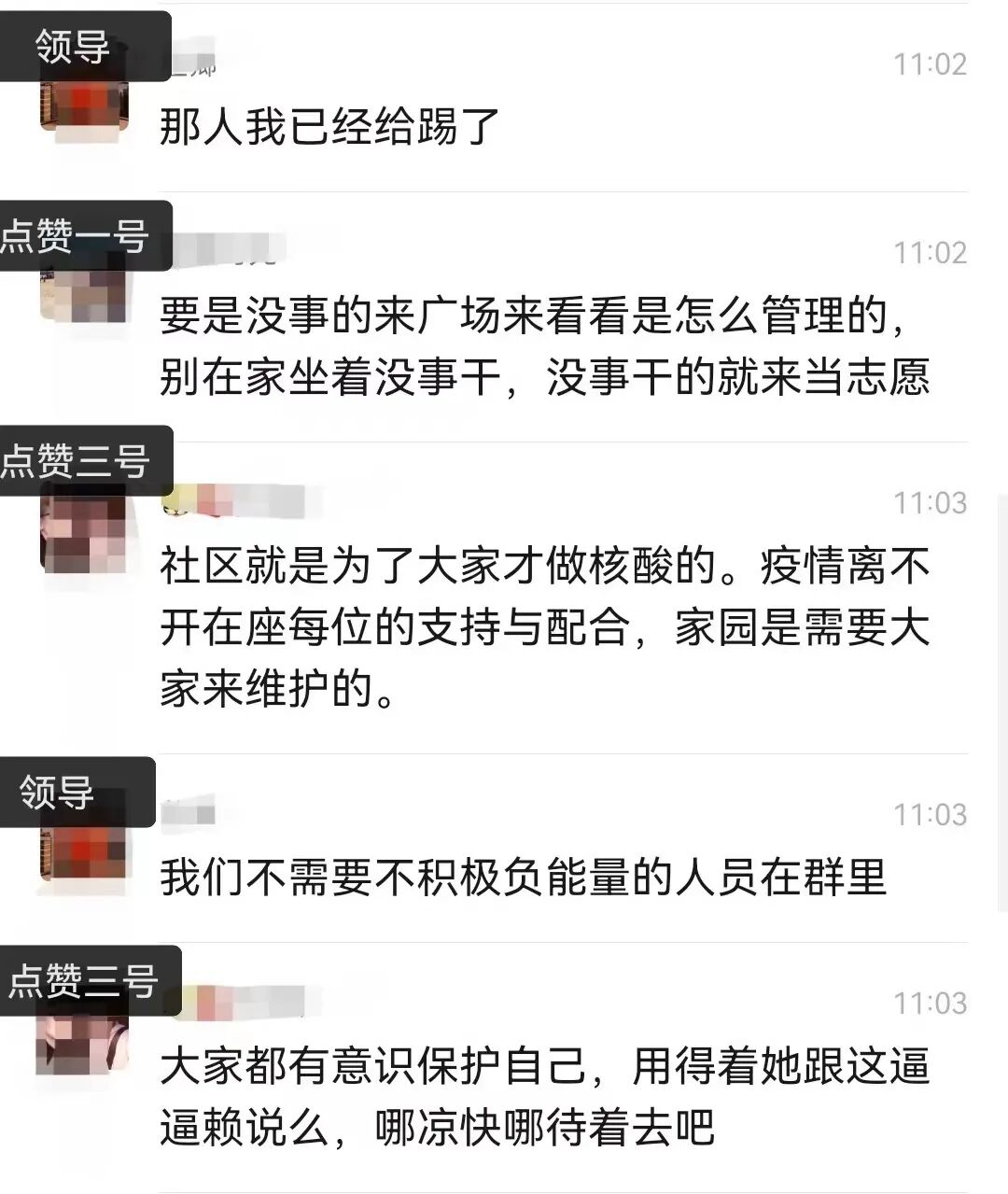 最后这场闹剧,以女领导将提意见的女业主踢出业主群,庸众们高喊我们不需要不积极负能量的在群里结束。