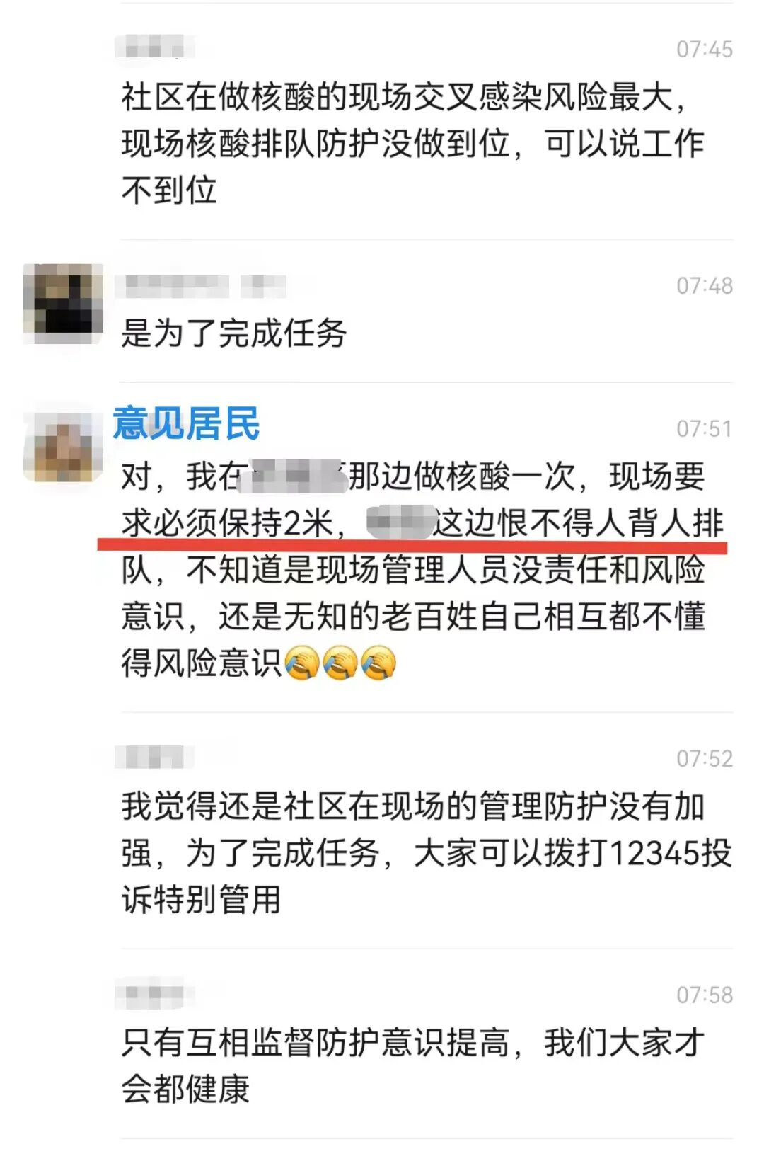 核酸排队的过程中应该是比较拥挤。据小区的业主描述,一度达到“人背人”般的密集程度,防护不够。有一位女业主就在群里提了意见:这样做核酸太密集了,有风险,应该保持2米安全距离。如果有问题大家打12345市民热线。