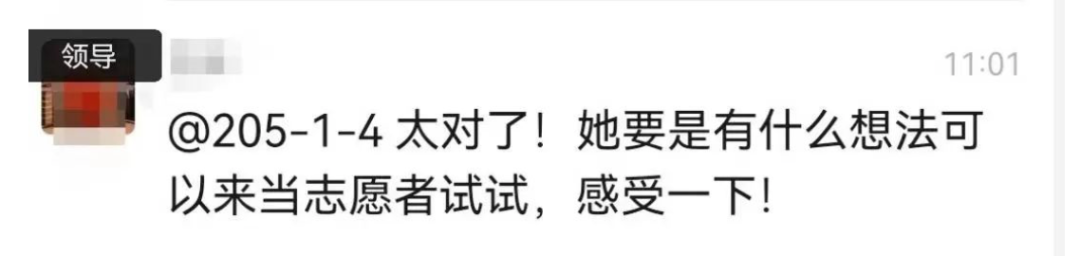 得到乌合之众支持的领导顿时也来劲了,说:太对了,她要是有什么想法可以来当志愿者试试,感受一下,不用在那站着说话不腰疼!