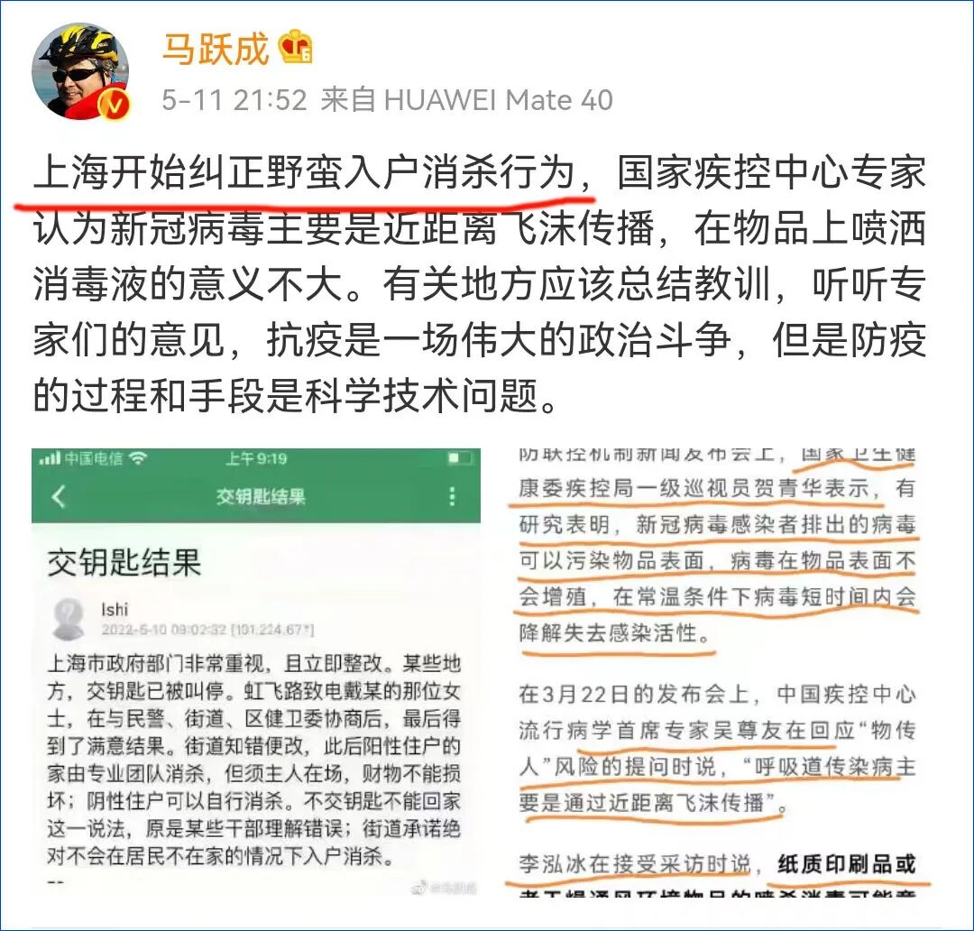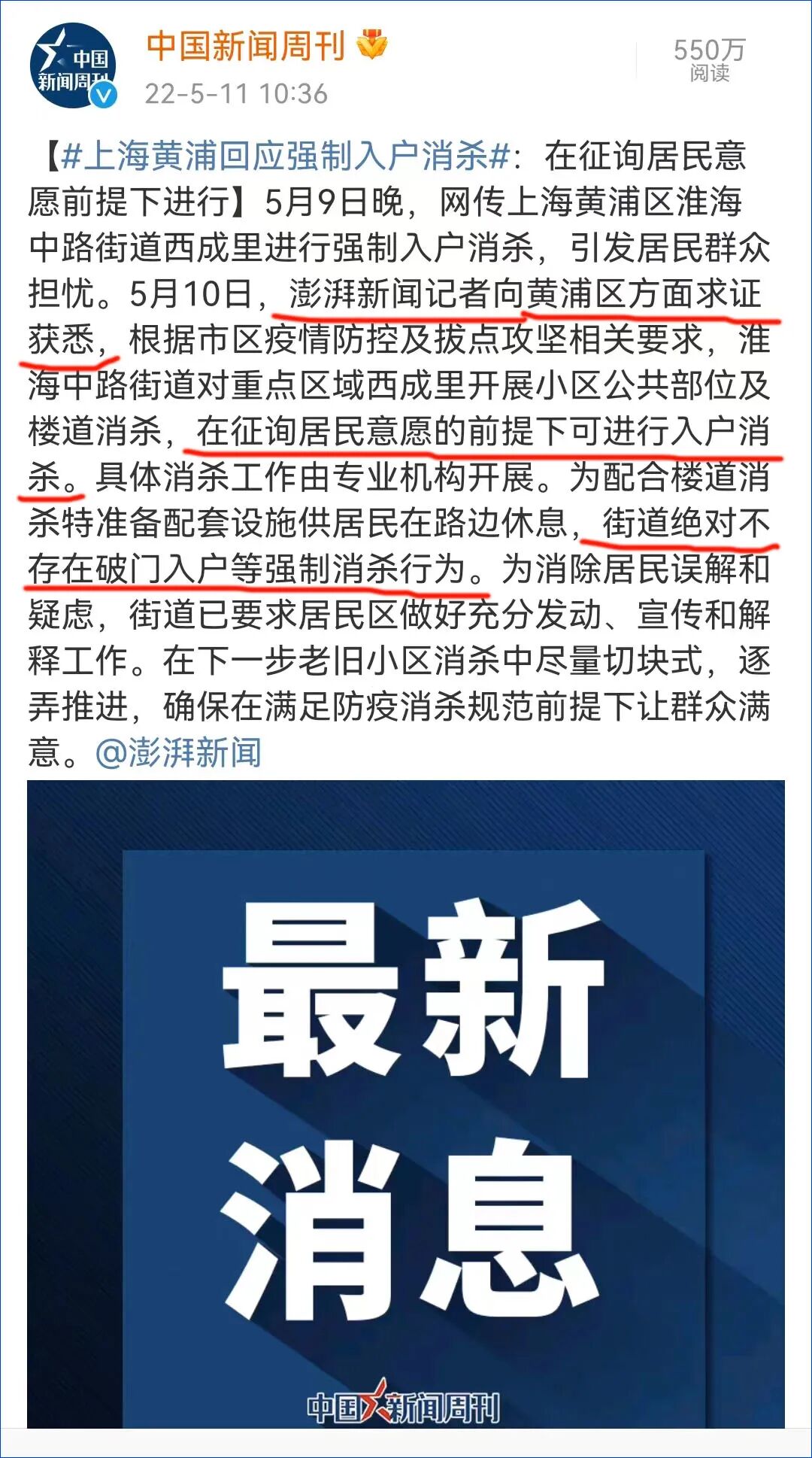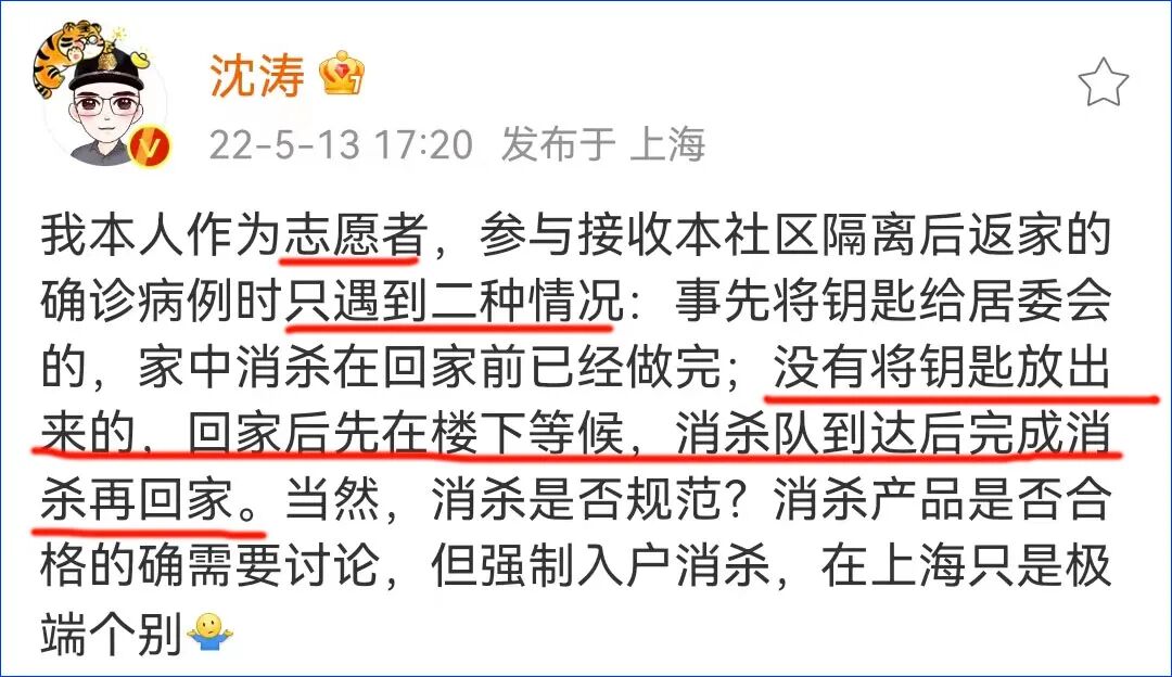 有一位在上海的志愿者也表示,强制入户消杀在上海只是极端的个别,他遇到的情况是,没有交钥匙的,“回家后先在楼下等候,消杀队到达后完成消杀再回家。”还有网友说,对于入户消杀引发的舆论争议,上海市相关部门也非常重视,“交钥匙已被叫停”。“阳性住户的家由专业团队消杀,但须主人在场,财物不能损坏;阴性住户可以自行消杀。”“街道承诺绝对不会在居民不在家的情况下入户消杀”。网友的这个说法,也得到了媒体的证实。5月10日,上海黄浦区相关部门在回答记者的采访时表示,“在征询居民意愿的前提下可进行入户消杀”,“街道绝对不存在破门入户等强制消杀行为”。