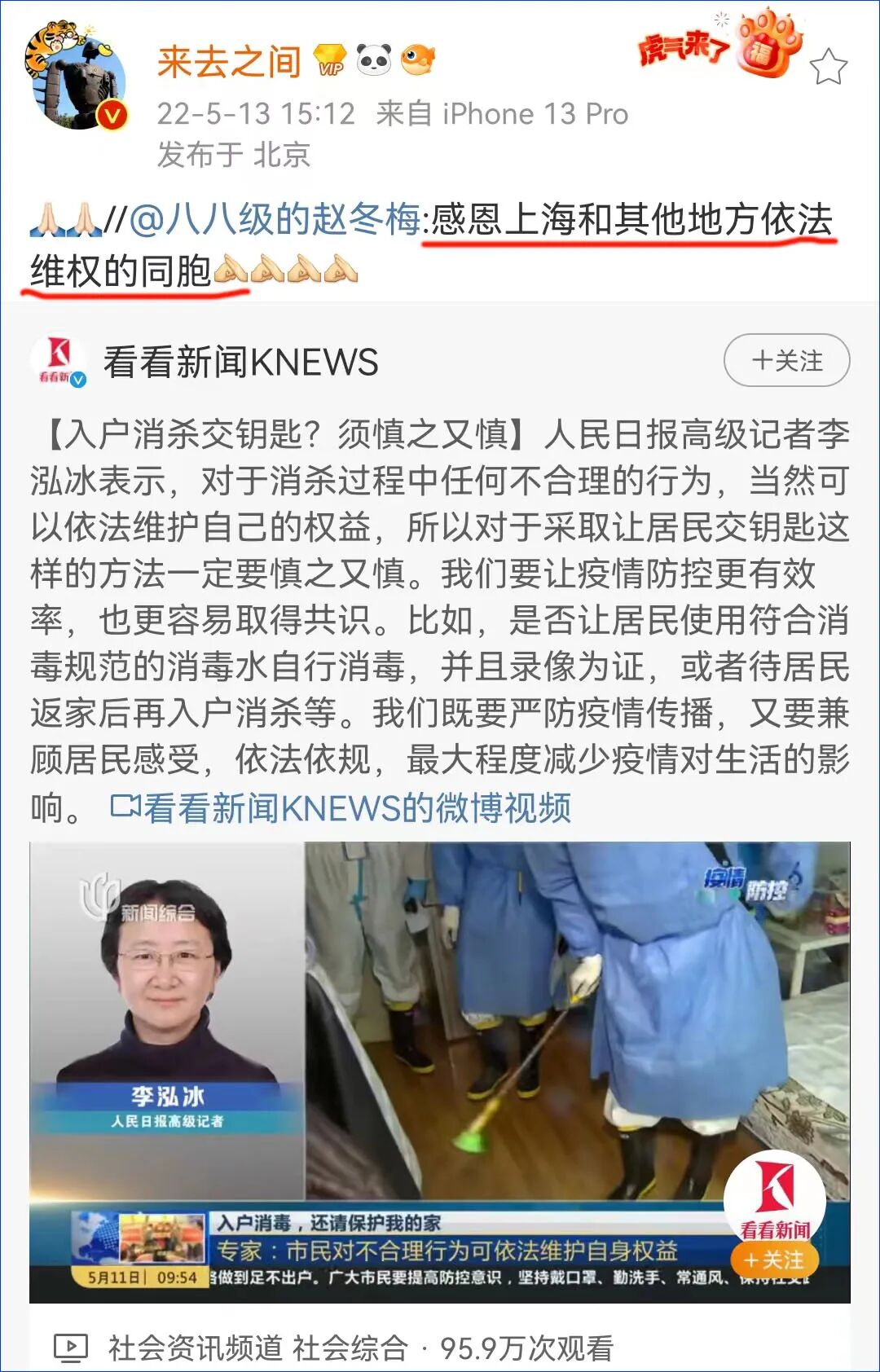 我不是上海人,但我要感谢上海的老百姓。在网上,也有很多人和我一样,在感谢上海依法维权的老百姓。我看到,在表示感谢的人里,其中就有微博的来总@来去之间。