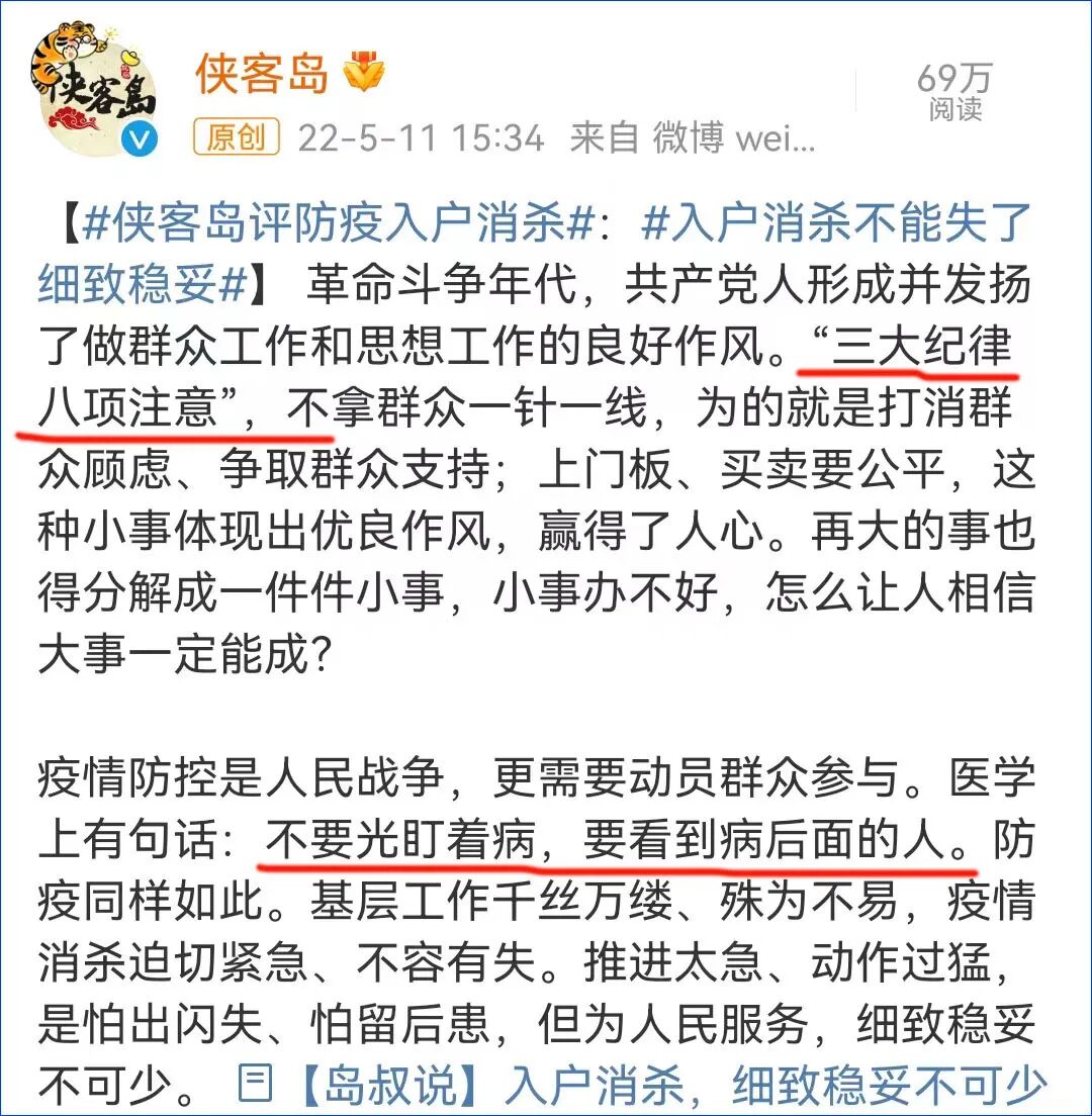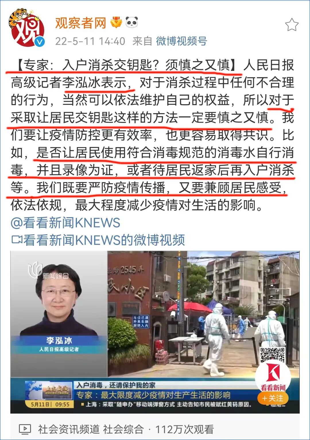 这种不断发出的声音,逐渐汇集到了舆论场上,引发了更多的关注。人民日报高级记者李泓冰表示,“对于采取让居民交钥匙这样的方法一定要慎之又慎”。为了最大程度减少疫情对生活的影响,李泓冰还建议,“是否让居民使用符合消毒规范的消毒水自入消毒”“或者待居民返家后再入户消杀”等。做到“既要严防疫情传播,又要兼顾居民感受”。人民日报旗下的侠客岛也发评论称,“入户消杀不能失了细致稳妥”,“不能光盯着病,要看到病后面的人”。在这则评论中,侠客岛还专门提到了共产党人在革命斗争年代始终坚持的“三大纪律八项注意”的优良作风。舆论场上的这些关注和争议,很快便得到了正向的反馈。上海已经对入户消杀进行了改进。