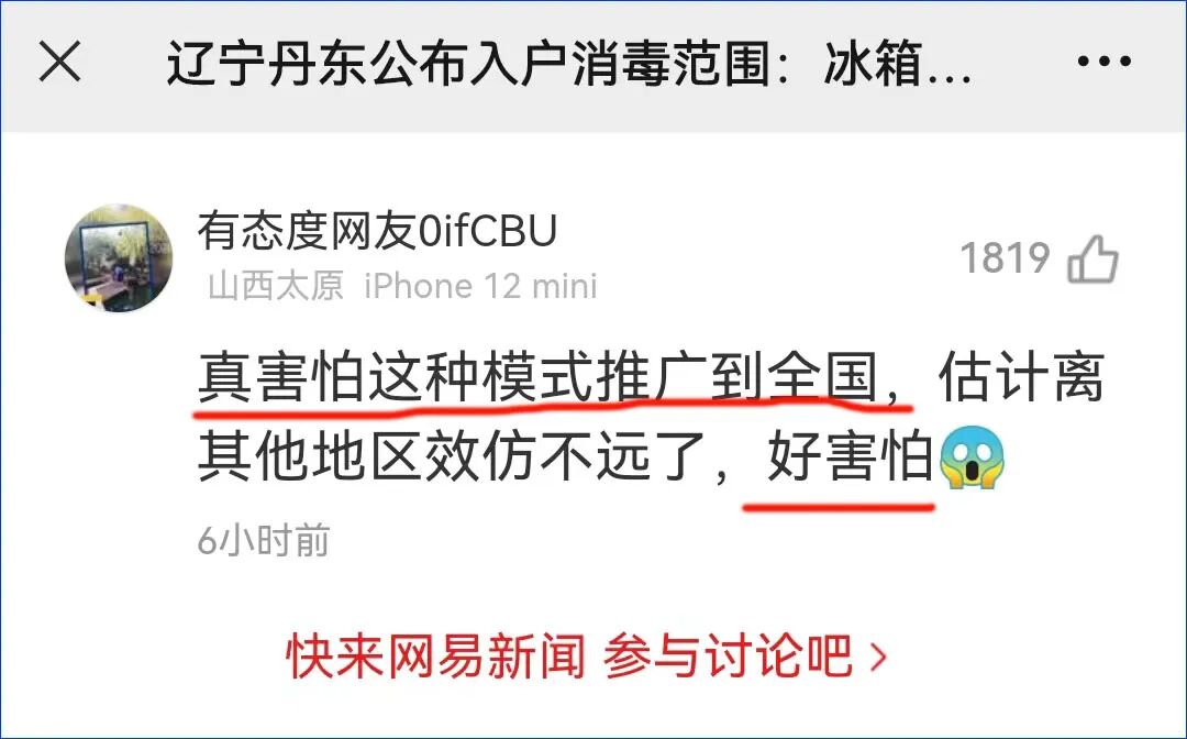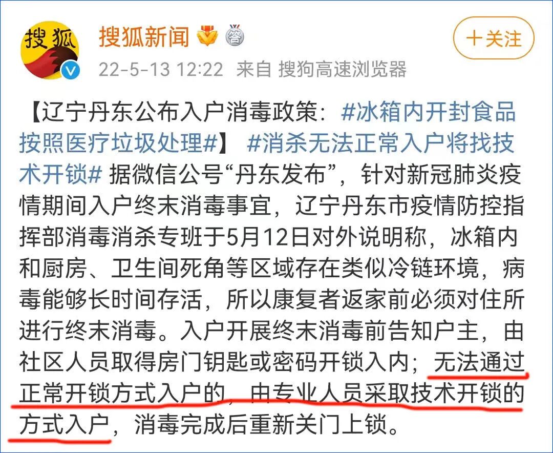 今天,有多家媒体报道了辽宁丹东发布的一则入户消毒政策:消杀无法正常入户将找技术开锁。