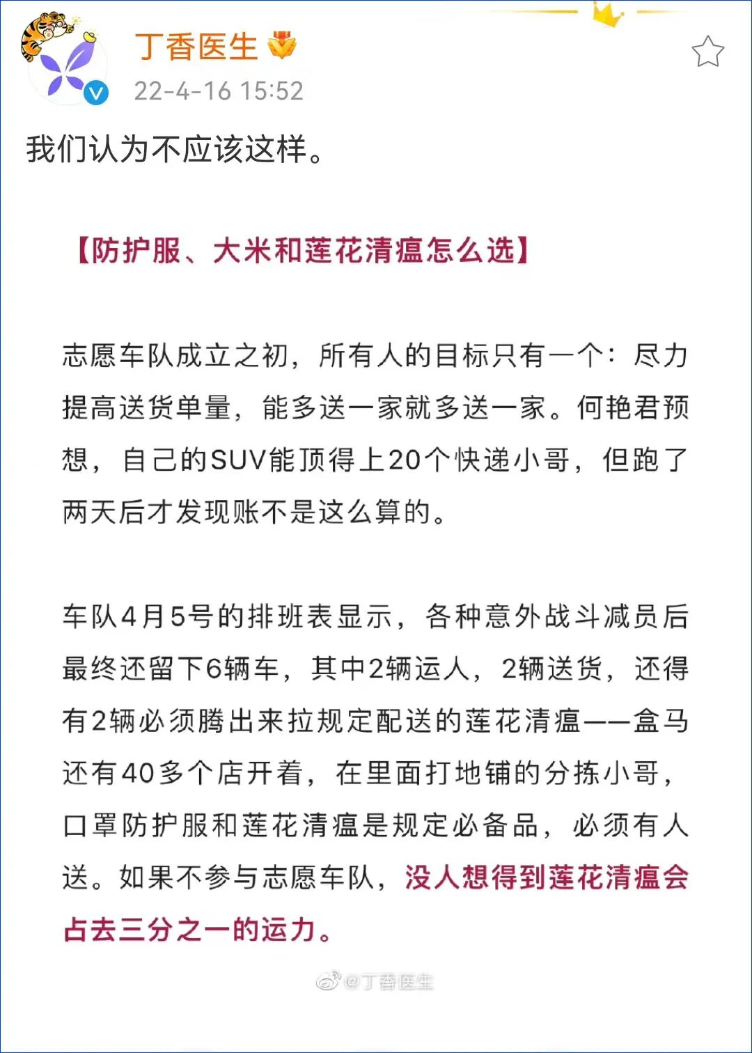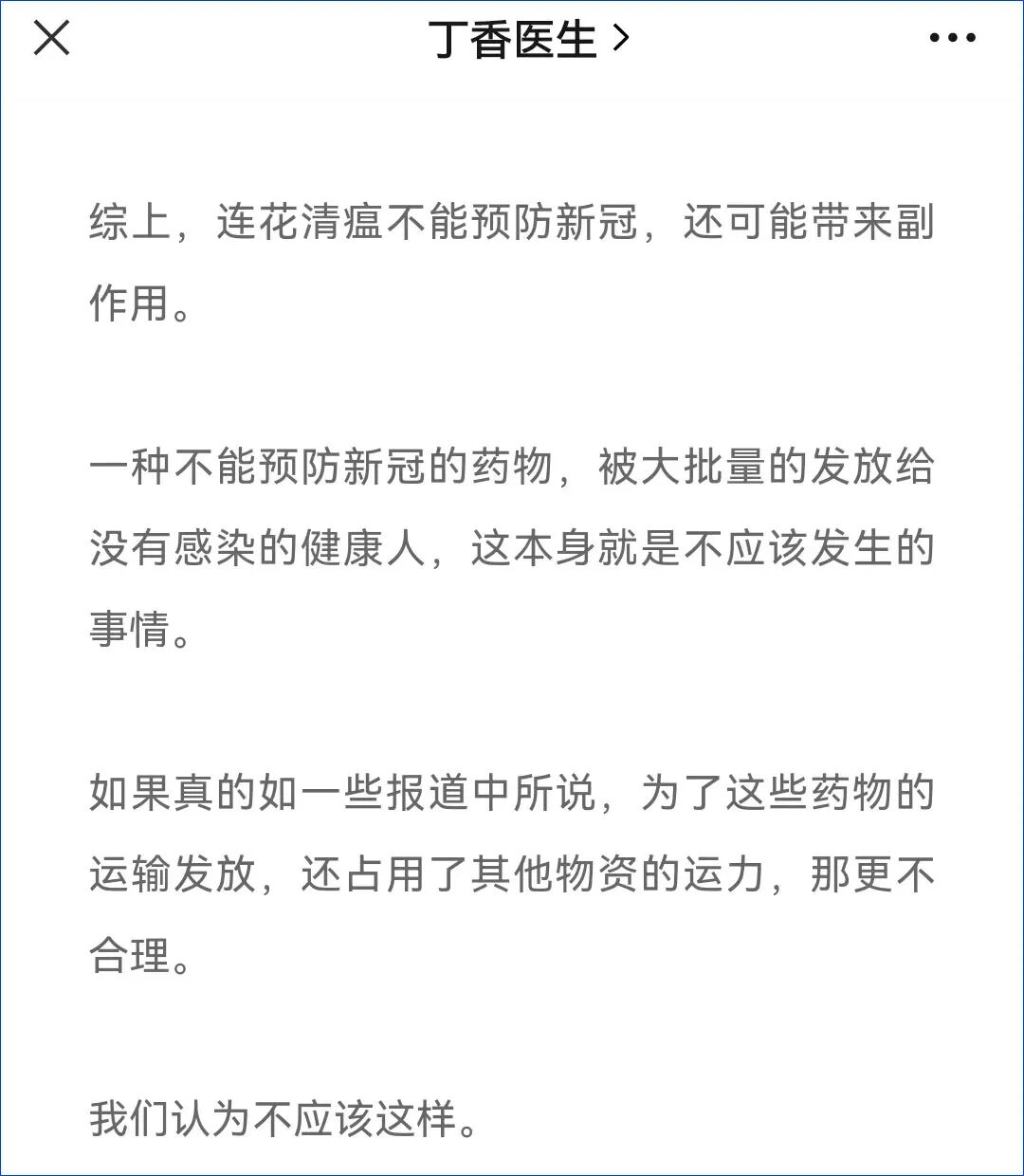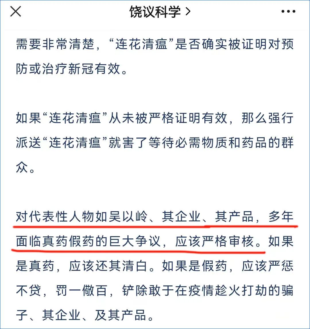 在更早些时候,媒体也曾发文提醒,连花清瘟不是新冠预防药,别乱吃!一些人开始疑问,为什么在上海,居民急需的生活物资匮乏,而不那么迫切的连花清瘟却能如此充足?4月16日,公号“为你写一个故事”发了一篇文章,《我在盒马当司机,才明白在上海送菜到底难在哪》。文章中提到,“6辆车,2辆运人,2辆送货,还得有2辆必须腾出来拉连花清蕴……”“没人想得到连花清瘟占据了一些志愿者三分之一运力”。在上海,运力高度紧张,很多居民称有拿到药的频率远比食物高。如果文中所述属实,连花清瘟占去过多运力,的确是匪夷所思。有医学背景的大V @丁香医生 转发了这张截图,称“我们认为不应该这样。”到4月17日凌晨,“丁香医生”在公号发文《不要吃连花清瘟预防新冠》,文章从有害成分,副作用等方面,指出“连花清瘟不能预防新冠,还可能带来副作用”。文章认为,“一种不能预防新冠的药物,被大批量的发放给没有感染的健康人,这本身就是不应该发生的事情。”丁香医生曾在2018年以一篇《百亿保健帝国权健,和它阴影下的中国家庭》的文章,将天津权健公司拉下神坛。2020年1月8日,权健公司老板束昱辉被法院以组织、领导传销活动罪判处有期徒刑九年,并处罚金。在丁香医生发文《不要吃连花清瘟预防新冠》以后,首都医科大学校长饶毅也在公号“饶毅科学”发文称,“疫情期间:不容假药趁火打劫,不宜强行派送未经证明的中药。”同时,饶毅在文章中呼吁,“对代表性人物如吴以岭、其企业、其产品,多年面临真药假药的巨大争议,应该严格审核……”疫情以来,连花清瘟一直是神一般的存在,但是关于其治疗新冠疗效的争议从未停止。