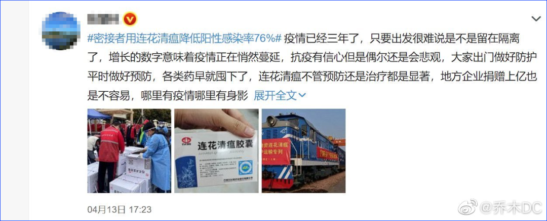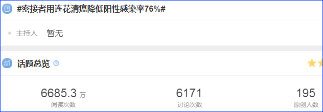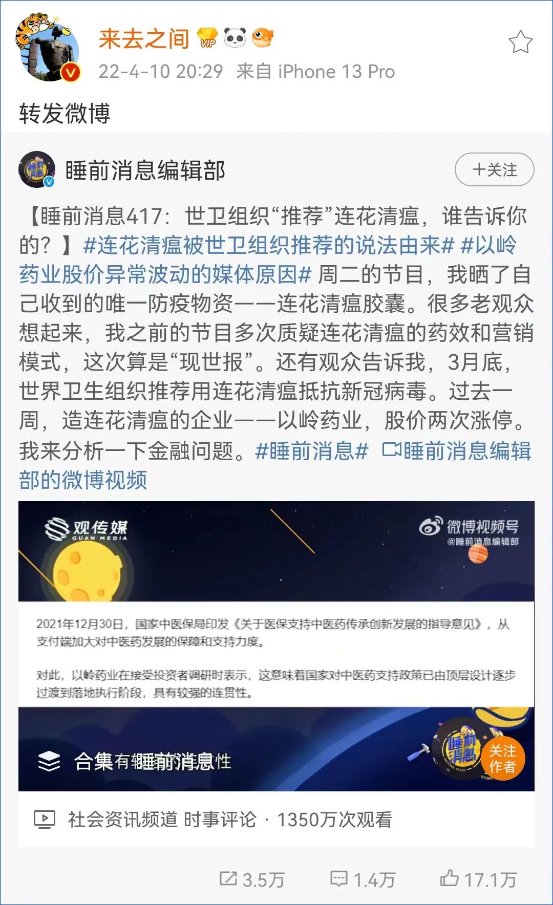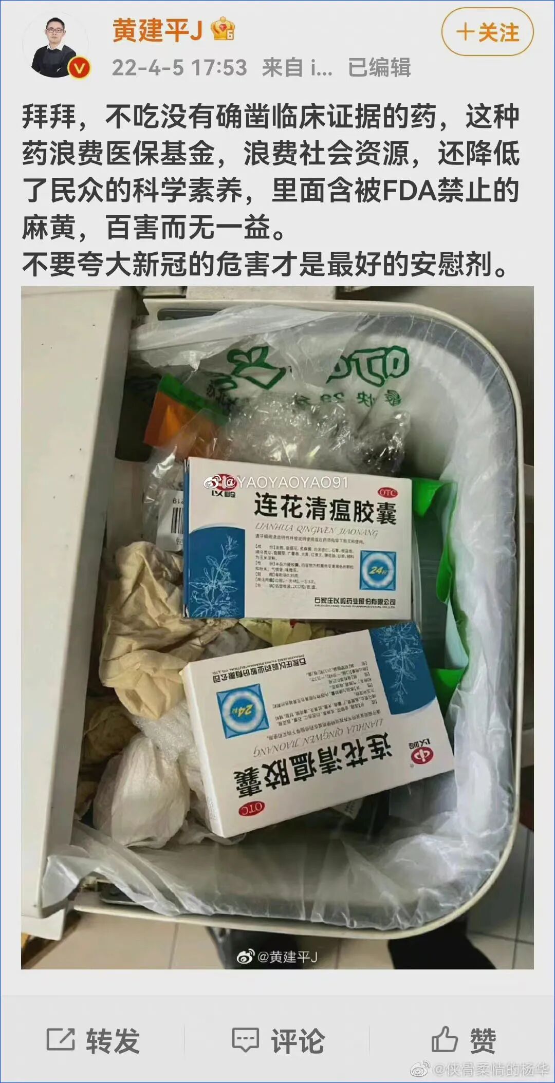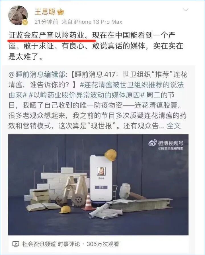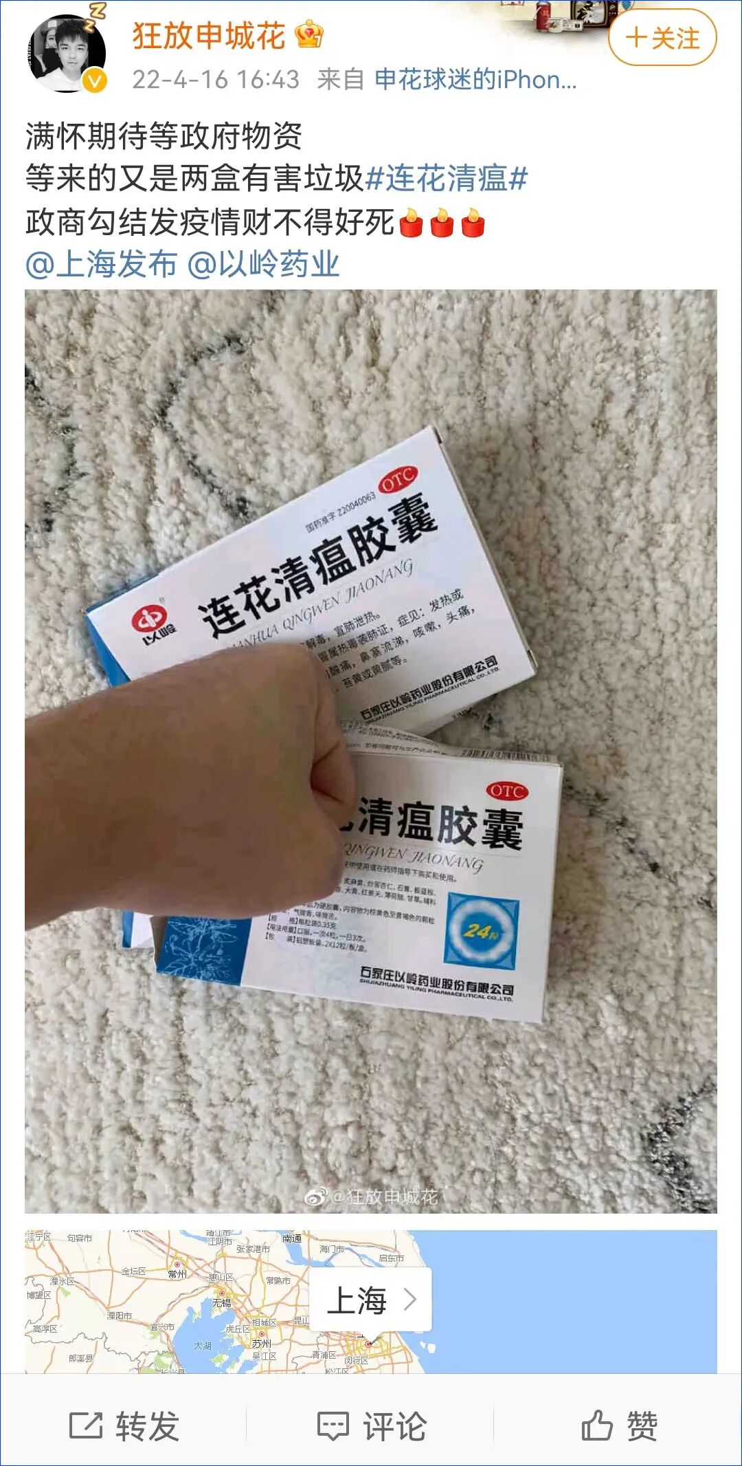 4月初,多家媒体发报道,将以岭药业和世卫组织的会议联系起来。有些媒体还用上了《世卫组织认可中医药治疗新冠疗效,连花清瘟防治获得可靠依据》的标题。与此同时,连花清瘟胶囊的生产企业以岭药业的股价迎来连续暴涨。4月10日,大V @睡前消息编辑部 发出一则微博,认为媒体的报道有误,同时对以岭药业股价飙升的合理性表示质疑。三天后,4月14日,王思聪转发了这则质疑连花清蕴的微博,并且呼吁:证监会应严查以岭药业。约一小时后,王思聪编辑了这条微博,删去了上述评论。但是,关于王思聪微博“手撕”以岭药业的消息依旧在网络上迅速发酵,也让沉寂许久的王思聪再次登陆热搜榜。除了这些大V,在网络上,还有很多人对连花清瘟提出了质疑。有上海居民吐槽,收到的连花清蕴太多,而真正用得上的生活物资匮乏。还有个别极端否定和排斥连花清蕴的网友,表示不吃,“百害而无一益”,并且晒出了将连花清蕴扔在垃圾桶里的图片。一位有医学背景的博主,也对这种乱发连花清蕴的现象表示了担忧和焦虑,连花清瘟发的太多,而且有人吃连花清瘟拉肚子了。博主在视频中呼吁,不要发连花清瘟了,多发两包葱吧。
