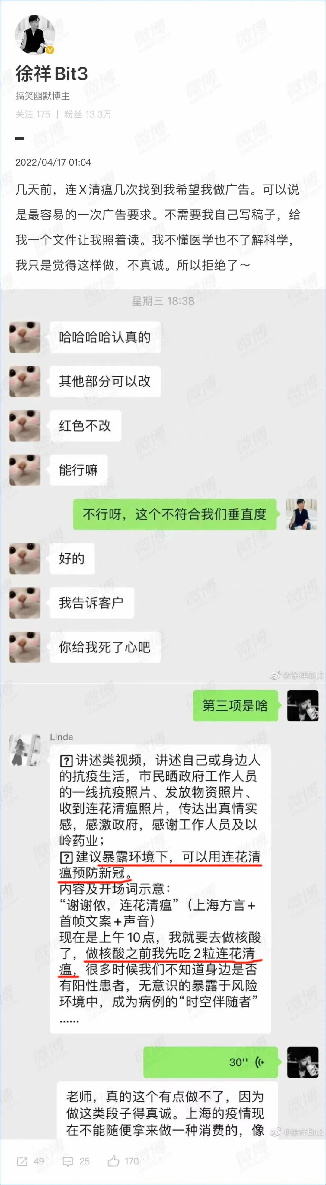 根据界面新闻的报道,2015年12月,连花清瘟胶囊还获美国食药监局(FDA)批准在美国开展二期临床研究,将依据国际规范化临床设计,筛选420名流感患者,展开为期6个月的随机、双盲、安慰剂对照研究。以岭药业称这是“全球第一个进入美国FDA临床研究的治感冒抗流感复方中药”。但是,六年时间过去了,这项预计“明年结果通过”的二期临床研究,依然没有公布结果。https://baijiahao.baidu.com/s?id=1730316282537794759至今为止,国家药品监督管理局从未批准过连花清瘟作为预防用药。也有多个医生明确表示,连花清瘟药物成分复杂,不适合用作于预防用药。还有医生表示,中草药含有的电解质很多,脾胃功能不佳、有胃溃疡、肝肾功能不好的人不适合服用该药,肾衰的病人可能会引起高钾血症。那么,这样一个不能用作预防,还可能存在副作用的药,为什么要向民众大量发放?连花清瘟的疗效究竟如何,外界一直存在诸多疑问,但蹊跷的是,在微博上有一个“密接者用连花清瘟降低阳性感染率76%”的话题。多个大V在这个话题下发文,内容雷同的宣传连花清瘟的功效。既然不能用预防用药,那这个“用连花清瘟降低阳性感染率76%”的话题是谁起的?这个“感染率降低76%”是从哪里来的?这是不是在欺诈和虚假宣传?是谁在组织这个话题的营销公关吗?是以岭药业的人吗?根据药品和广告法规,组织者和参与者要不要承担违法责任?网上有大V曝料,称有自称是连X清瘟的人,找他做广告。但博主不愿意见利忘义,就拒绝了。从这位博主提供的聊天截图来看,对方提议的宣传文案中有“暴露环境下,可以用连花清瘟预防新冠”“做核酸之前我先吃2粒连花清瘟”一类的内容。如果这个曝光的内容属实,那策划这种宣传文案的人是谁?是以岭药业的人吗?策划这种宣传文案,是不是在向外界传递连花清瘟可以预防新冠的错误信息?疫情以来,很多行业都受到了影响,一些中小企业更是生存困难。生产连花清瘟的以岭药业股价持续走高,可谓赚的盆满钵满。面对有关连花清瘟的巨大争议,以岭药业会不会给出一个明确的说法?连花清瘟有没有被严格证明有效?至于以岭药业有没有虚假宣传,相关部门要不要做一个调查?正如饶毅教授所说,“如果是真药,应该还其清白。如果是假药,应该严惩不贷,罚一儆百,铲除敢于在疫情趁火打劫的骗子、其企业、及其产品。”上海,小提琴家求诊遭拒跳楼自杀
