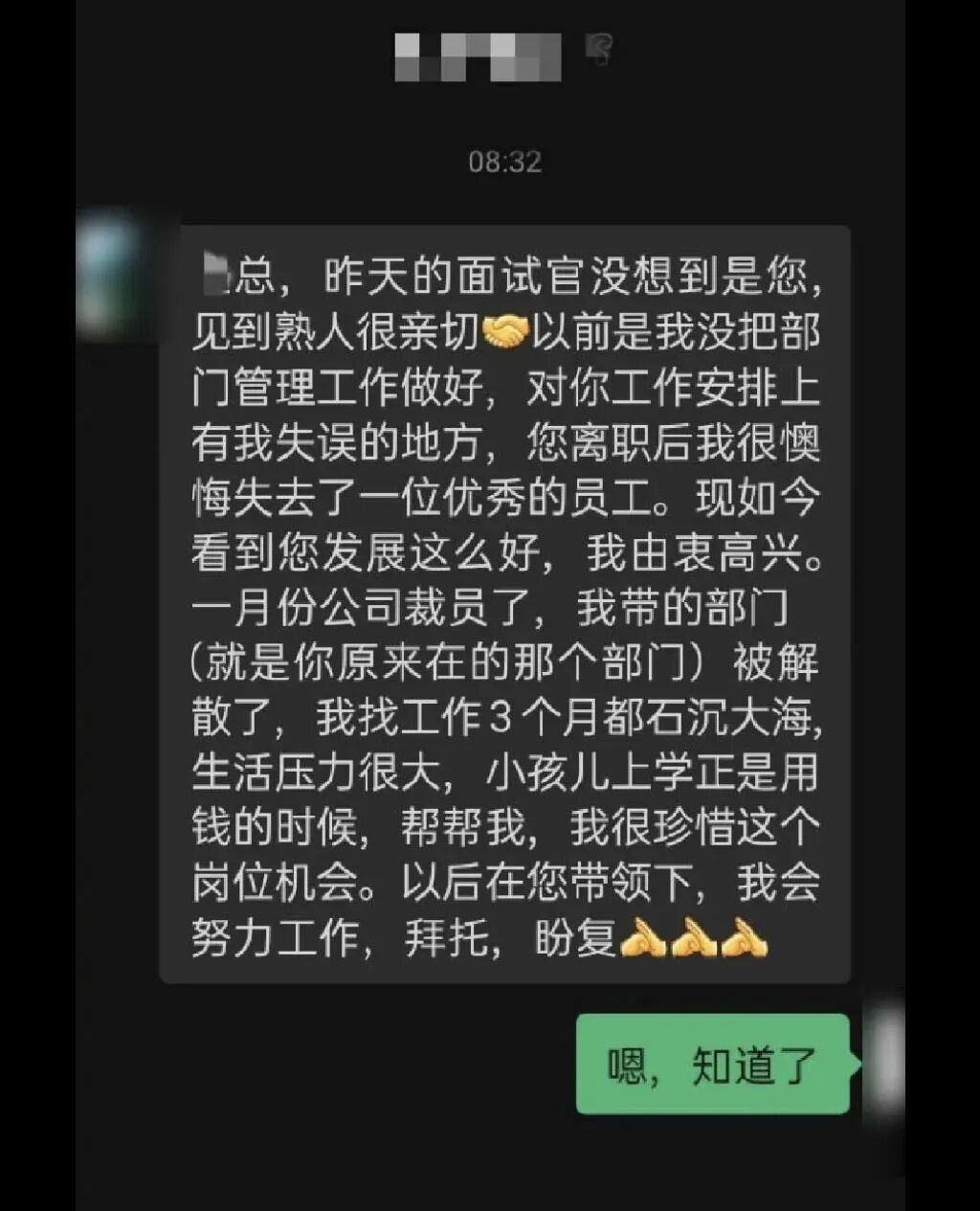 最近做了一场特殊的面试,应聘者是以前工作中的上司。面试前我看过简历,知道是他,但他不知道面试官是我。今早收到他发来的信息。我很犹豫,能力真的一般,典型职场老白兔,不太想用,我想把工作机会留给有能力的人。
