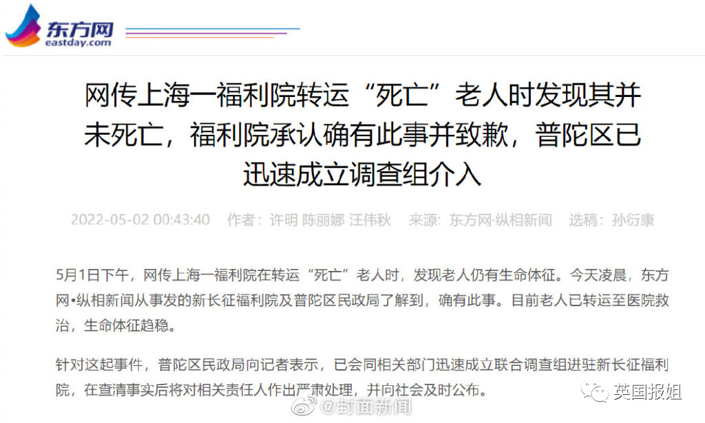 然而令人难过的是,今天早晨当地新闻媒体证实,上海市普陀区某福利院老人未死亡就被拉走“确有其事”,5人涉嫌渎职。