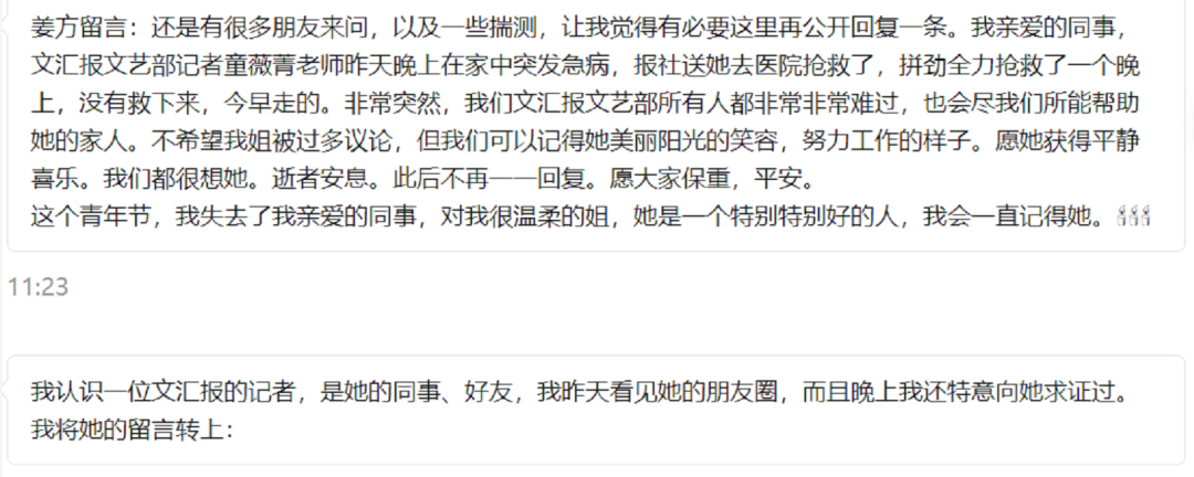 在写今天的文章前,先给大家看个留言,是关于童薇菁去世内情的,这是来自文汇报记者的消息。