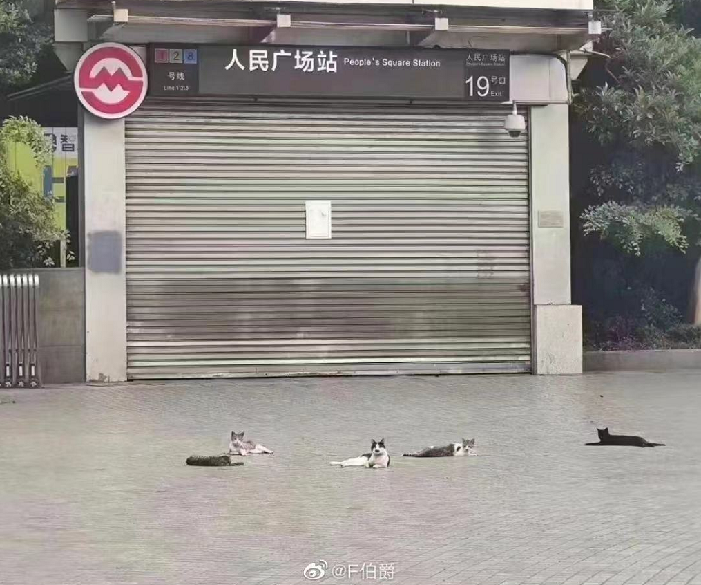 之前很热闹的人民广场地铁站没有了人流,只有几只小猫安静地趴着。