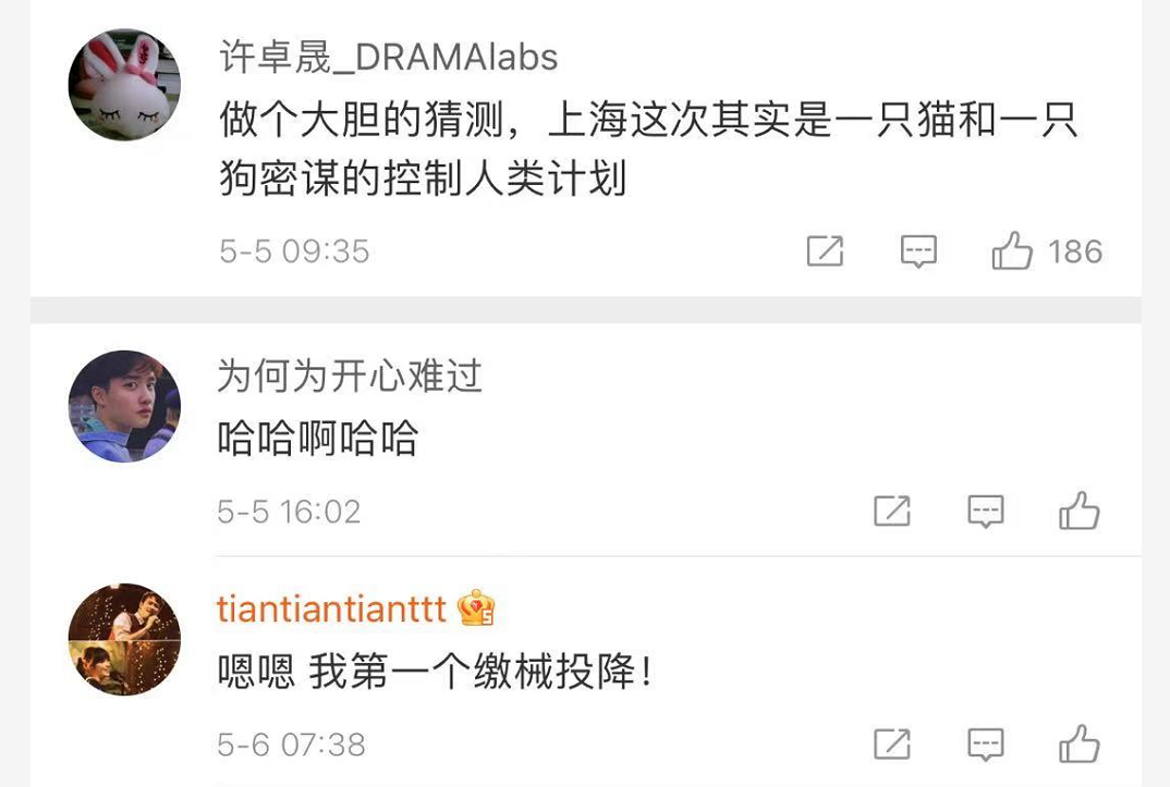 我希望小猫小狗们能悠然地散步,我更希望上海、杭州和北京的普通人们能够安心自在地过着,可以尽情地吃喝玩乐,享受着一个普通人的俗世幸福时光,而不是像现在这样苦涩难熬。