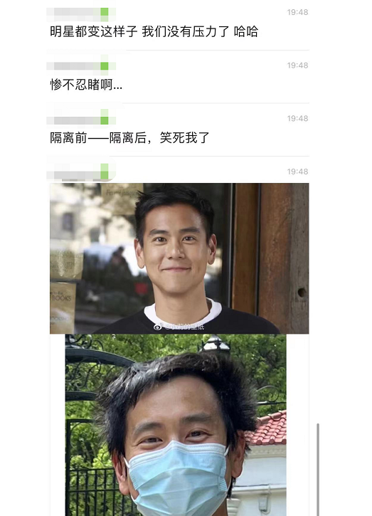 明星们也没好到哪里去,比如彭于晏被隔离的这些天,头发已经乱了,于是赶紧跑了。