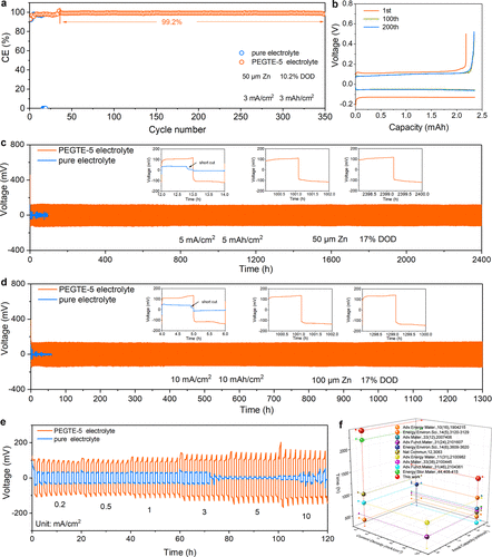 图5. (a) 在3 mA/cm2 和3 mAh/cm2 ,在有PEGTE和没有PEGTE的电解液中,Zn镀层/剥落的CE。(b) PEGTE-5电解液中Cu||Zn电池的电压曲线。(c, d) 对称Zn||Zn电池在(c) 5 mA/cm2 和 5 mAh/cm2 和 (d) 10 mA/cm2 和 10 mAh/cm2 的循环性能。(e) 对称电池的速率性能。(f) 对称电池的循环稳定性比较。