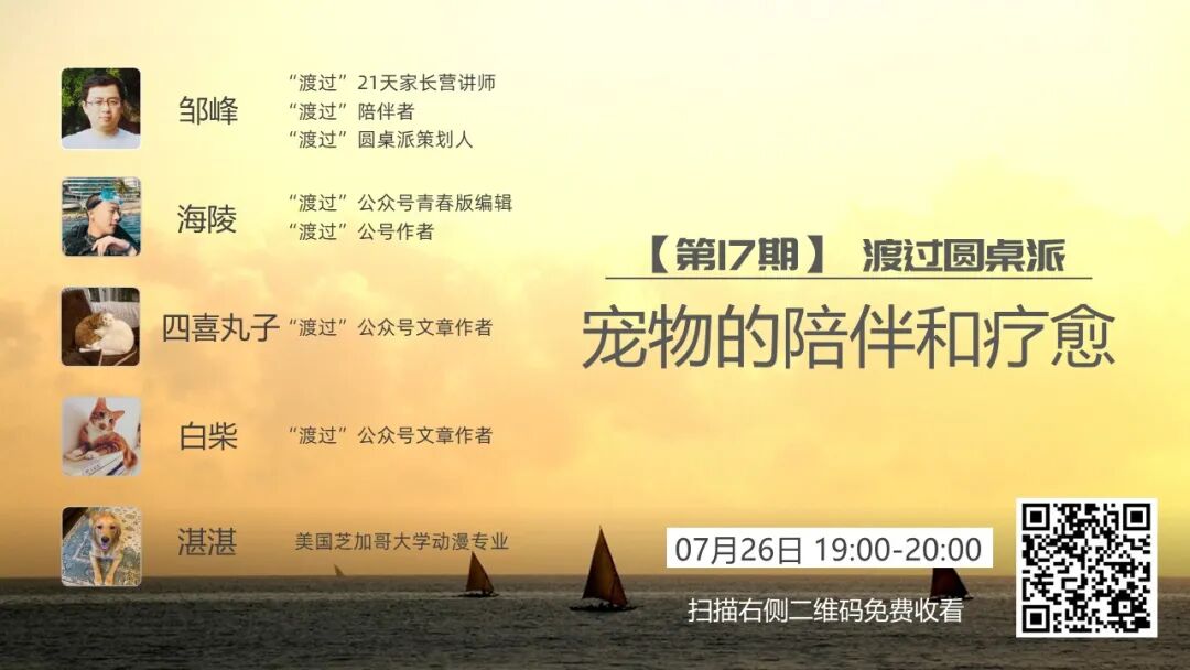 本次圆桌派请来几位多次参加渡过亲子营的小伙伴,海陵,四喜丸子,湛湛,还有一位有志做心理治疗师的大学毕业生小骆驼,一起聊聊他们的宠物陪伴故事。