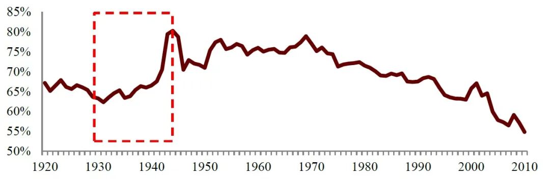 这种情况直到1933年大萧条之后的罗斯福新政才迎来转机(图表5),罗斯福坚持以政策干预来弥补劳动力市场的天然缺陷,先后推出了《工业复兴法》(1933年)、《劳资关系法》、《社会保障法》(1935年)以及《公平劳动标准法》(1938年)等法案,实行最低工资制度、限制最高工时并改善劳动条件,明确要求资方不得干涉工人组织工会和行使集体谈判权,赋予了劳动与资本更平等的交易地位,大幅缓和了自工业革命以来日益激化的阶级矛盾,为资本主义可持续发展扫清了道路。
