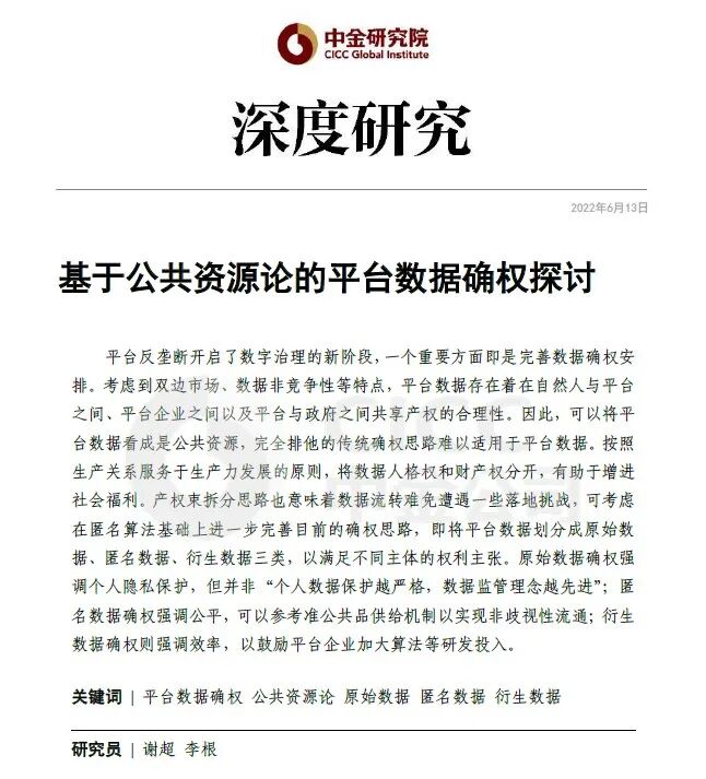 本文参考:2022年6月13日中金研究院已发布的《基于公共资源论的平台数据确权探讨》,作者信息为: