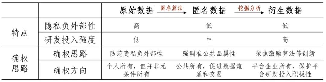 匿名数据指的是对个人原始数据进行匿名化之后的平台数据。经过匿名化处理后,原始数据的个人可识别性显著降低,数据确权的目标从保护个人隐私,转向促进数据流通,以最大限度地发挥平台数据的非竞争性优势,最大限度地实现平台数据在企业间以及企业与政府等社会机构间的共享。