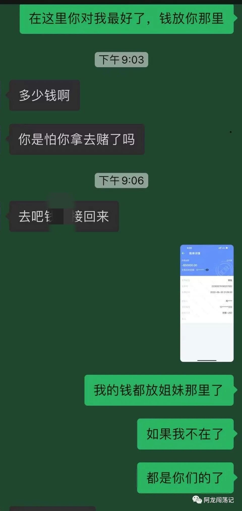 她说,我把50000美金都转给闺蜜了,我准备跳楼了,所以留钱没用了,我死了以后,这些钱都留给她们花吧……