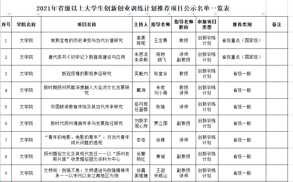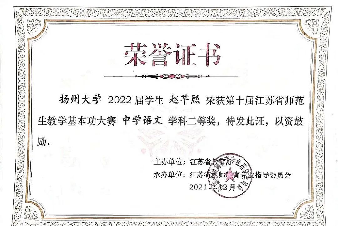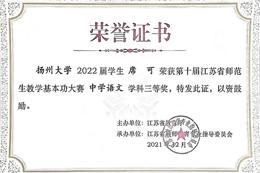 近三年来,本科生获得国省级科技创新项目27项,全国大学生英语竞赛一等奖1人,全国高校秘书专业知识技能大赛个人一等奖2人、团体一等奖1项,全国商务秘书职业技能大赛个人综合一等奖1人、专项事务处理项目一等奖1人、团体一等奖1项,全国汉语国际教育综合技能大赛特等奖1项,江苏省师范生基本功大赛一等奖1人,江苏省大学生艺术展演甲组特等奖1项。