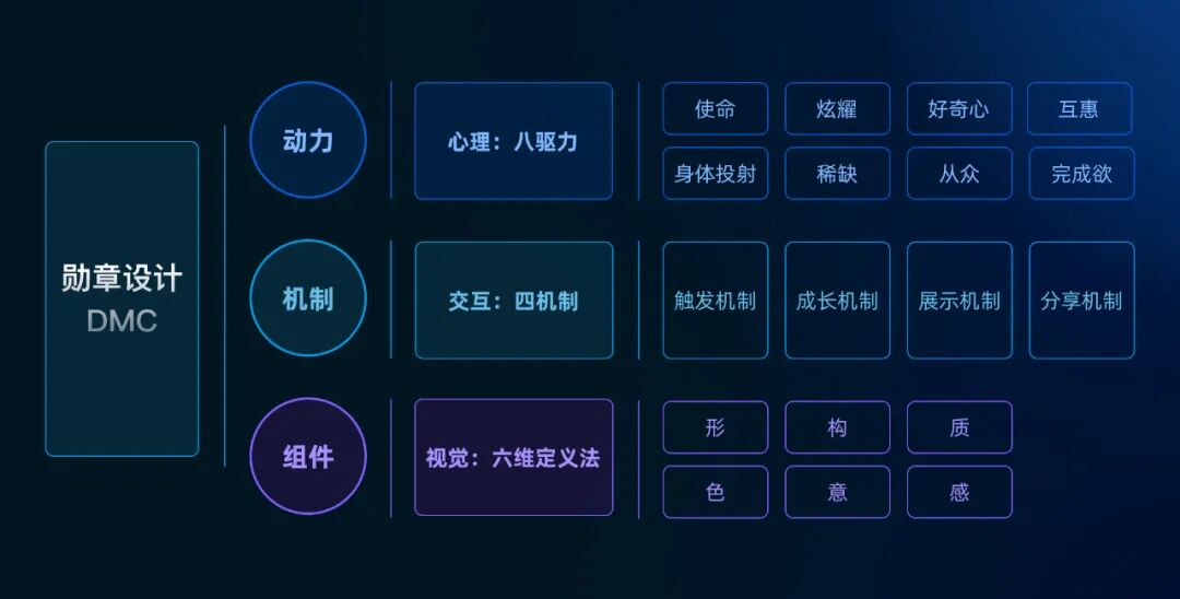 我们运用游戏化设计思维,结合大量勋章设计案例的分析,总结出了一套勋章设计的DMC模型,这套模型可帮助设计师高效地进行勋章的具体执行设计。