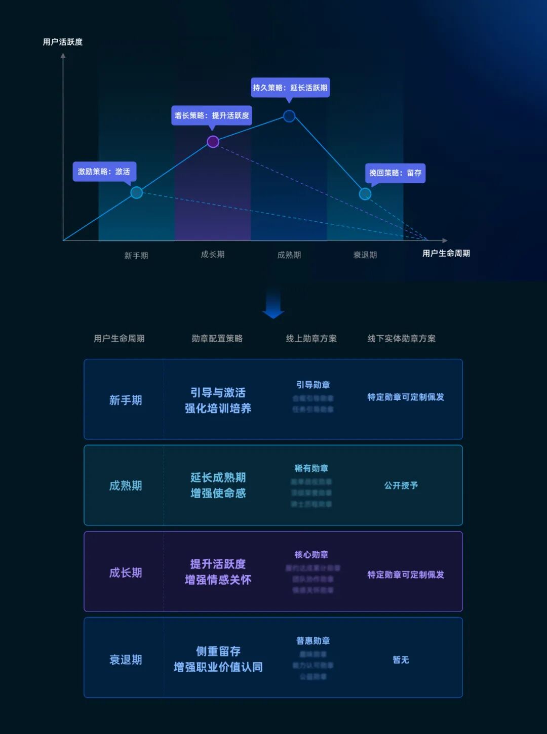 勋章的设计,需要针对新手期、成长期、成熟期、衰退期、流失期这5个时期来设计不同的勋章激励策略,建立与用户之间有效的精神情感连接。