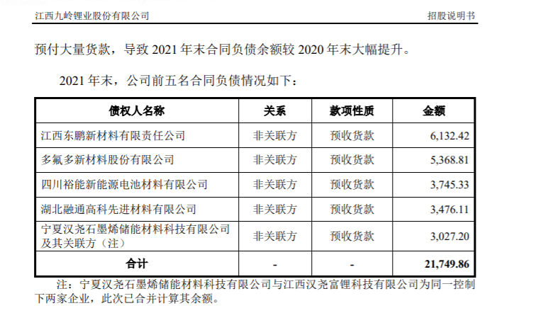 比如,对大客户多氟多预收款为5368.81万元,而对方的预付款对象中,仅有第一名款项在千万元以上,但其对应的6066.76万元预付款额与九岭锂业披露的相差了697.95万元;