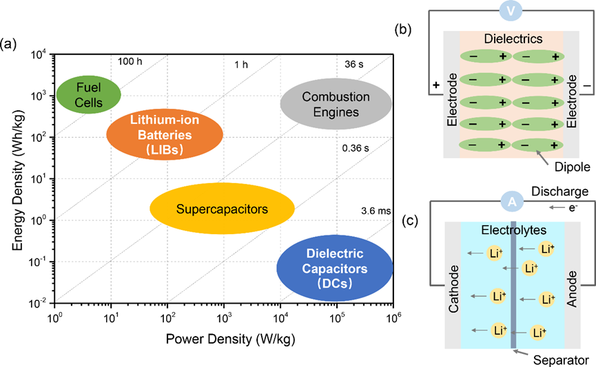 图1 (a)常见电能存储技术的功率密度和能量密度对比图 (b)介电电容器充电过程示意图 (c)锂离子电池放电过程示意图