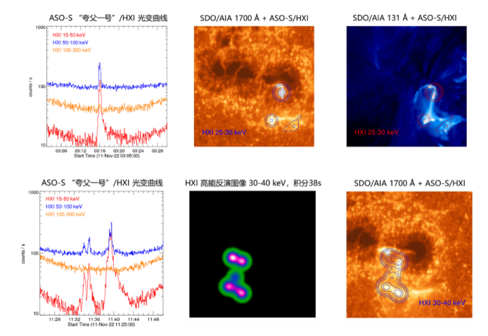 图3和图4分别展示了太阳硬X射线成像仪(HXI)在2022年11月11日观测到的“双11”系列耀斑的硬X射线成像结果与AIA/SDO同时观测到的紫外1700埃图像的比较、耀斑硬X射线光变及硬X射线成像与AIA/SDO的极紫外/紫外图像的合成图。从图中可以清楚看到,硬X射线源的位置与紫外亮结构的位置在高空间分辨率下完美重合,特别值得注意的是,HXI具有对复杂源的成像能力,成像的可靠性得到了充分确认。