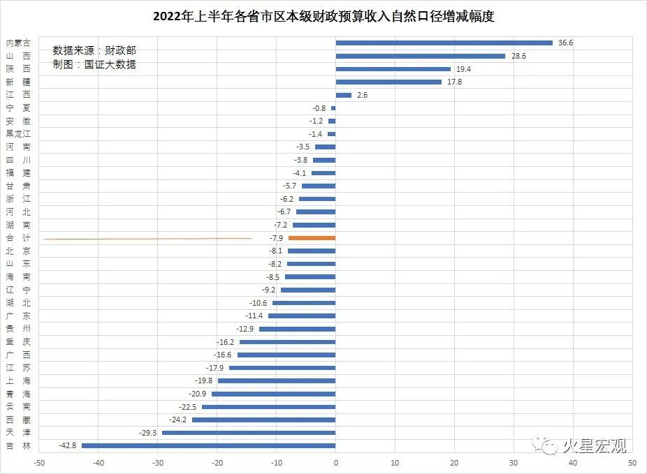 上半年,31个省市自治区,仅有内蒙、山西、陕西、新疆和江西5地财政收入同比增长,其余16个地方政府财政收入均有不同程度下降。下降幅度在5%以下的,有6个地方;下降幅度在5-10%的,有8个地方;下降幅度在10-20%的,有7个地方;还有5个地方下降幅度超过了20%。其中吉林财政收入下降42.8%,天津与西藏财政收入分别下降了29.3%和24.2%,云南与青海的财政收入分别下降了22.5%和20.9%。