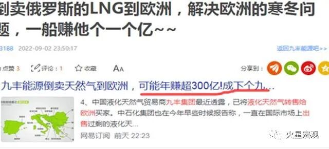 还有不少人发布消息说,民营上市公司九丰集团靠向欧洲转售了81万吨俄罗斯天然气,每艘气船可挣1亿美元,今年赚得盆满钵满。