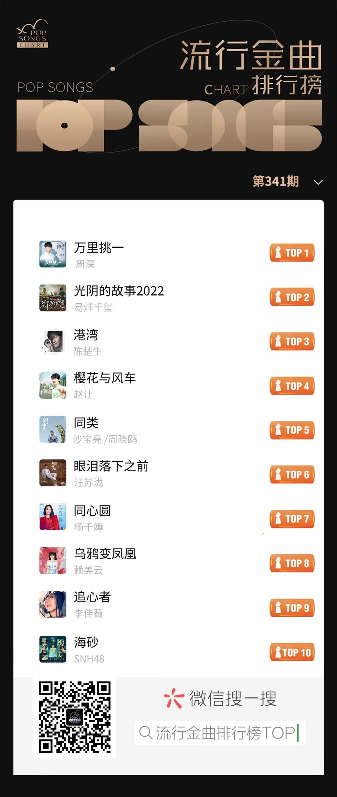 流行金曲排行榜第341期榜单揭晓!来看看有哪些你喜爱的歌手上榜吧!
