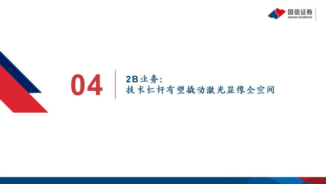 ALPD技术具有色域广、亮度高、成本低等优点,在激光光源、激光光机、影院放映机、激光商教工程机等B端和激光电视、激光微投等C端市场都具有广泛的应用空间。1)C端方面,激光投影差异化优势显著,成长性强,未来五年内激光电视和激光微投有望分别达到80亿以上的规模,长期稳态下预计合计规模或可超千亿。公司凭借ALPD核心技术的强大领先优势,在产品、人员、营销和渠道上全面发力,随着自有品牌占比提升,有望在行业高增期实现量利双提升。2)B端方面,光源、光机业务预计将随着行业的发展而迅速起量,租赁服务业务有望在激光光源替代氙灯光源这一大趋势下持续扩大涵盖范围,激光商教工程业务有望结合公司的技术优势与合资方的渠道优势不断扩大市场份额,B端亦具有广阔的发展空间。
