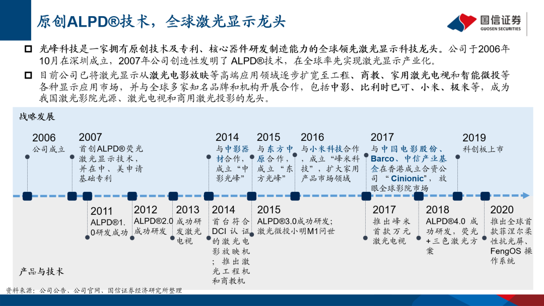 光峰科技是一家拥有原创技术及专利、核心器件研发制造能力的全球领先激光显示科技龙头。公司于2007年创造性发明了 ALPD技术,在全球率先实现激光显示产业化。目前公司已将激光显示从激光电影放映等高端应用领域逐步扩宽至工程、商教、家用激光电视和智能微投等各种显示应用市场,并与全球多家知名品牌开展合作,成为我国激光影院光源、激光电视和商用激光投影的龙头。