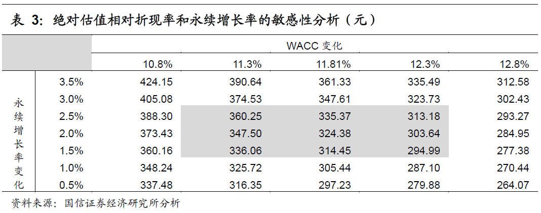 该绝对估值相对于WACC和永续增长率的敏感性分析如下: