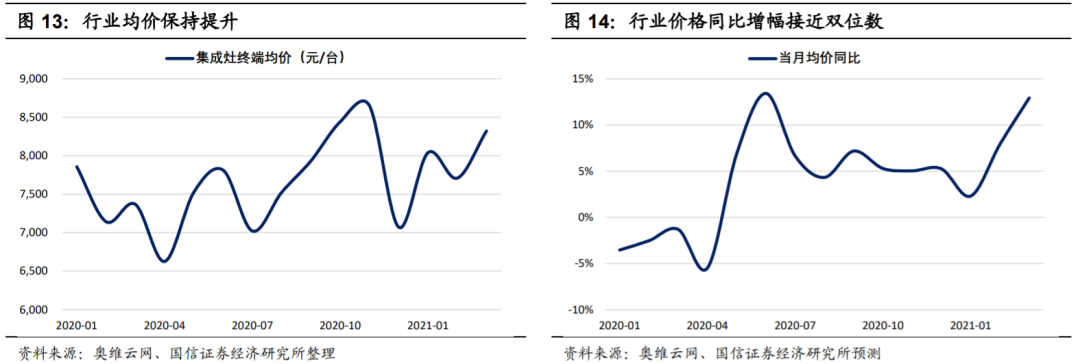 2021年以来头部企业已经依靠推新+结构调整拉升均价。根据奥维云网数据,2021Q1行业均价在蒸烤一体比例提升、叠加部分新品推出的拉动下同比增长8.2%,同时从月度价格变动来看,2020Q2起行业价格即回暖上涨,结合上表的原材料上涨对应的成本传导力度,若出厂价格提升靠近双位数,则整体盈利能力有望基本保持稳定。