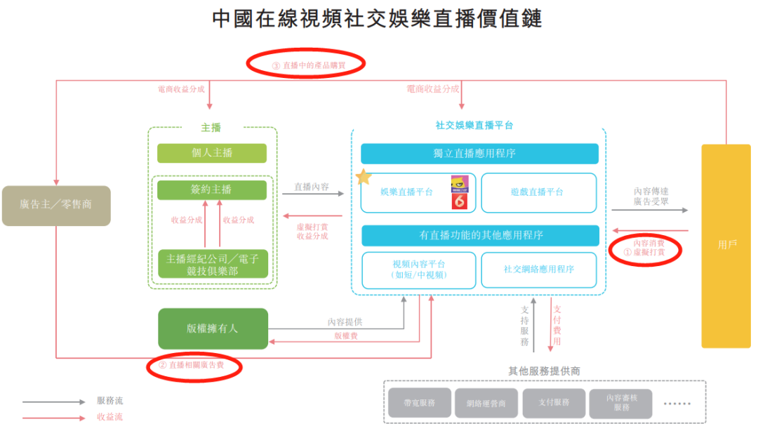 而在线视频直播类平台,能产生收益的主要有三个渠道:用户打赏,广告费以及电商收益分成(直播带货)。