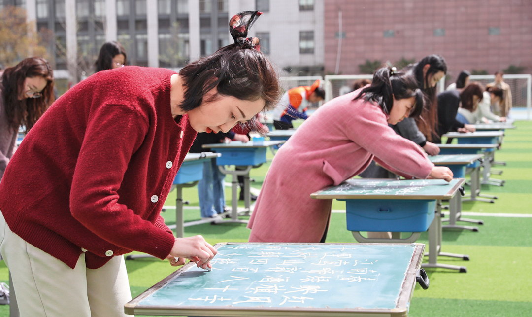 2021年3月29日,江苏淮安,小学老师参加粉笔字基本功比赛