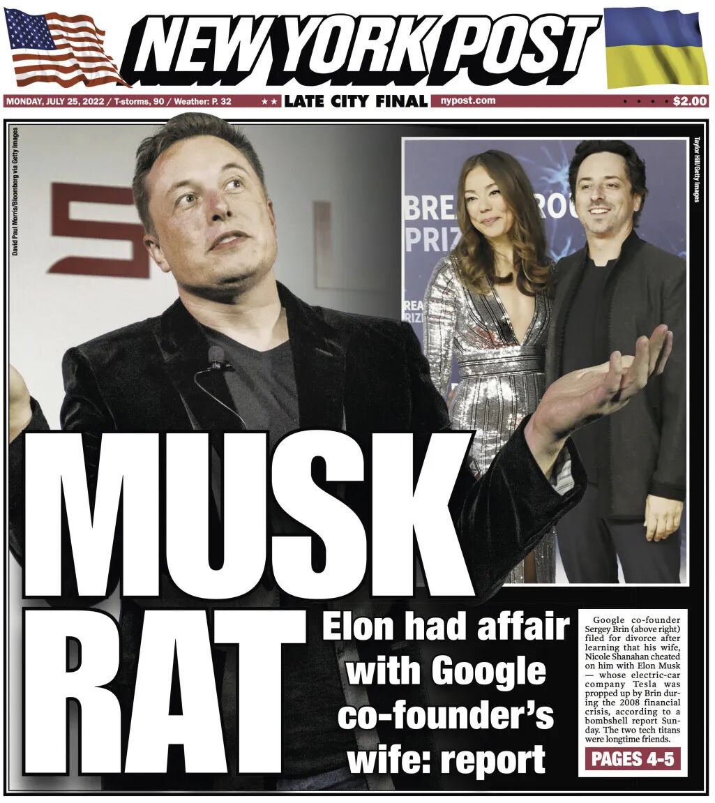 2022年7月25日,《纽约邮报》封面报道马斯克的花边新闻。(@视觉中国 图)