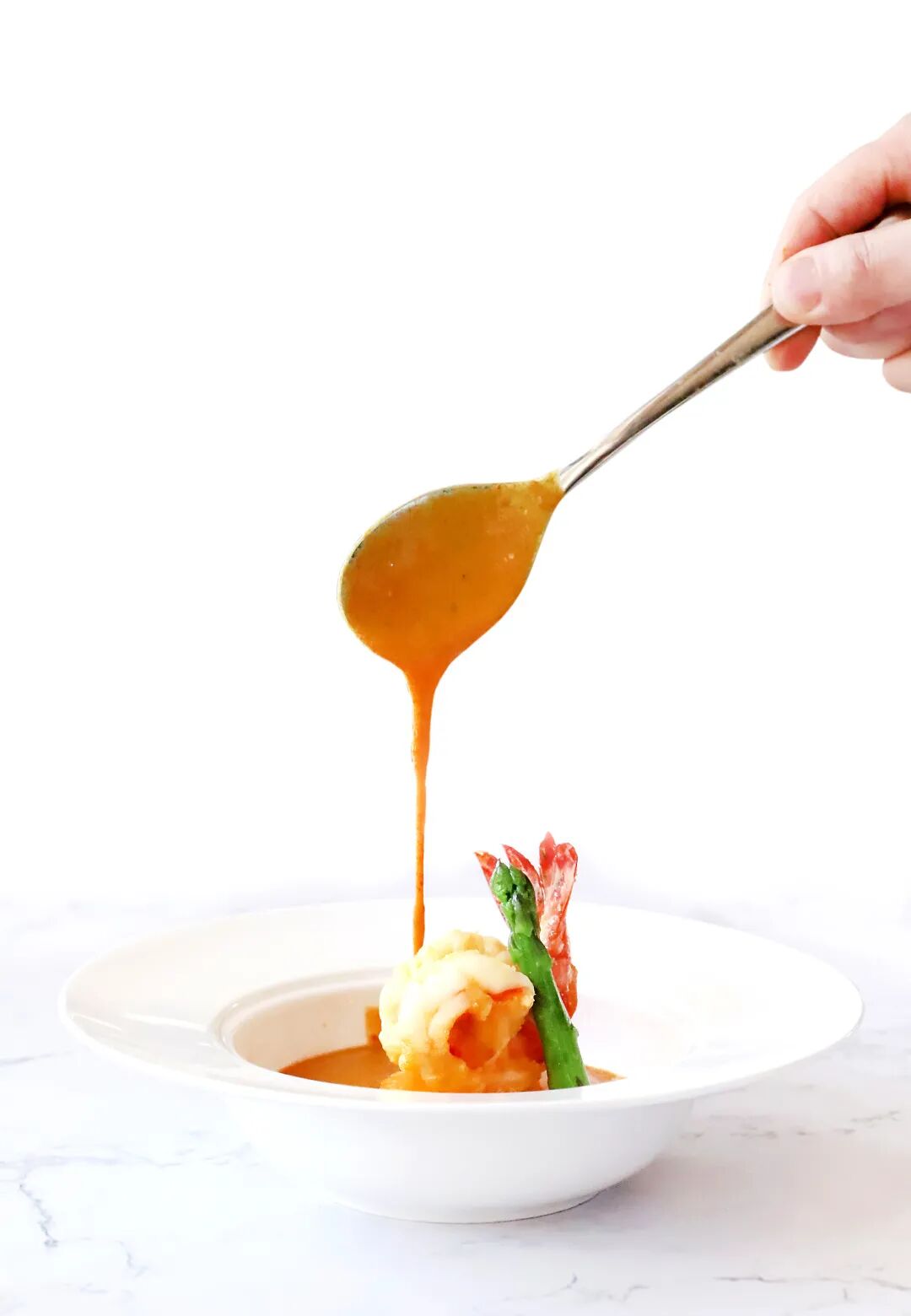 龙虾浓汤配蟹肉春葱饺子