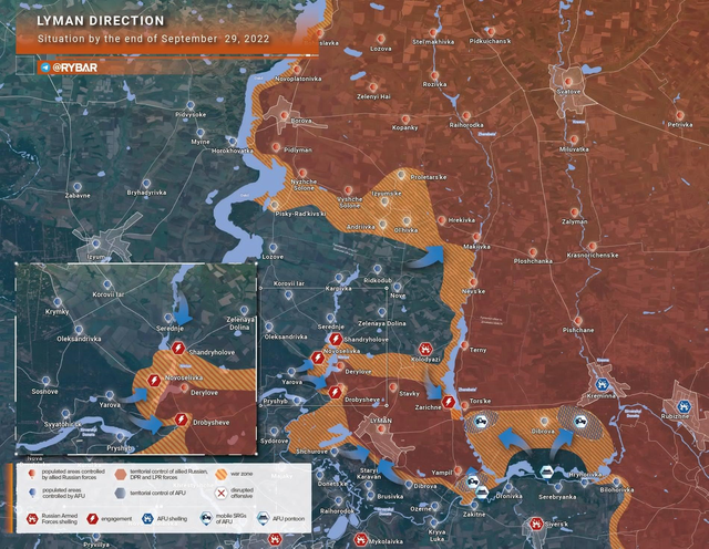 为掩饰俄军仓皇溃逃,俄罗斯国防部称:“面对被包围的危险,联军退出莱曼,撤到更安全的前线”。周六稍早,乌军宣布,守卫莱曼的5000-5500残余俄军已陷入重围。