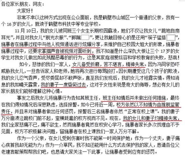 得知女儿的悲惨遭遇后,小雅的父亲找过老师,找过学校,也报了警,但是即便是报警之后,这3名女学生依然在学校正常上课,似乎根本没有因为此事受到一丁点影响。