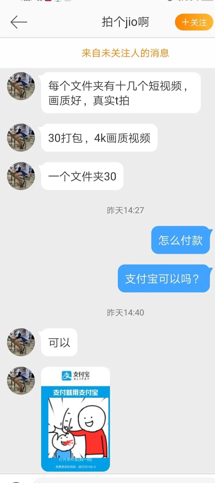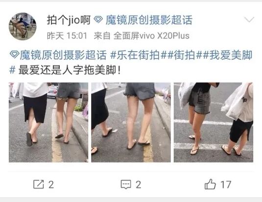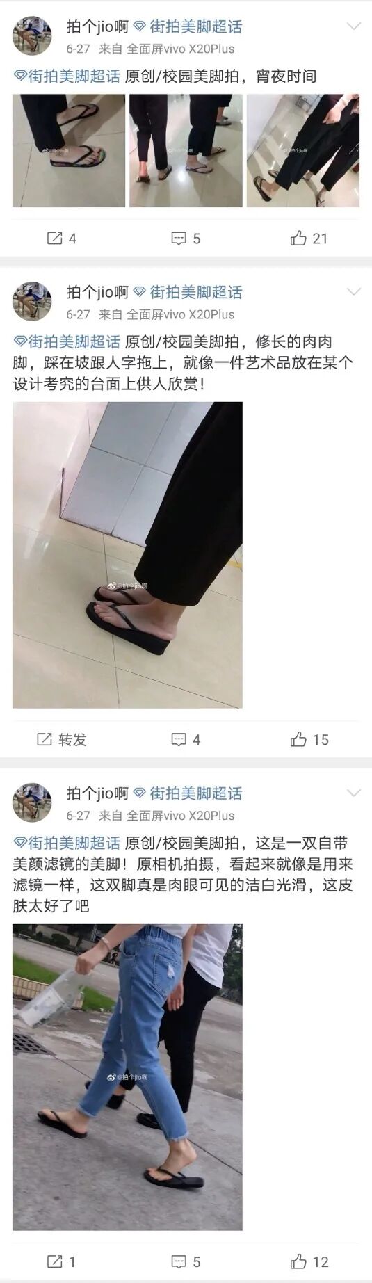 有同学在微博上发现一个账号通过专门偷拍的女生照片进行售卖盈利,微博动态会发一些偷拍女生下半身的照片来吸引有这方面癖好的人群进行一些黑暗的交易。(图片尚未完全证实)
