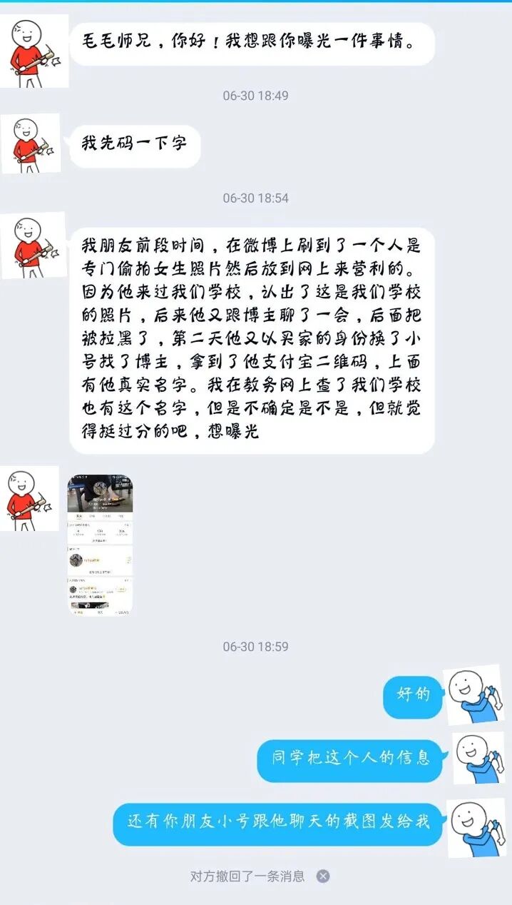 这位博主通过微博这个窗口来引诱卖家,私信进行交易。把别人的隐私当作赚钱的工具,来获取利益满足自身的私欲。校方还在调查是否是事件当中那个猥琐男所为。