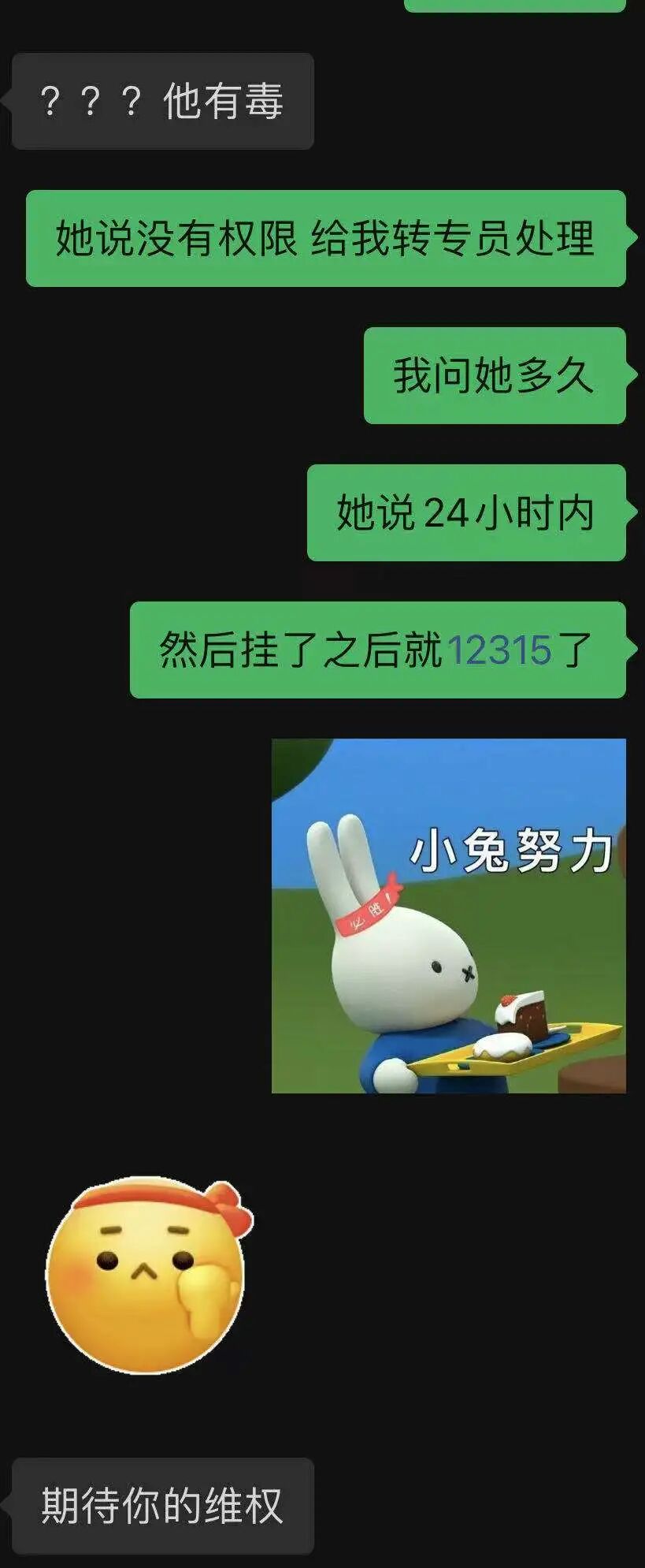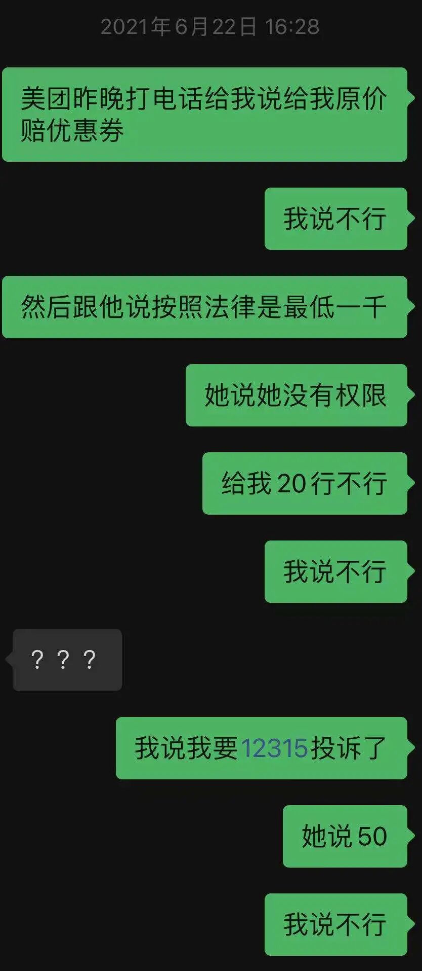 题主表示要12315投诉,美团给出50元,
